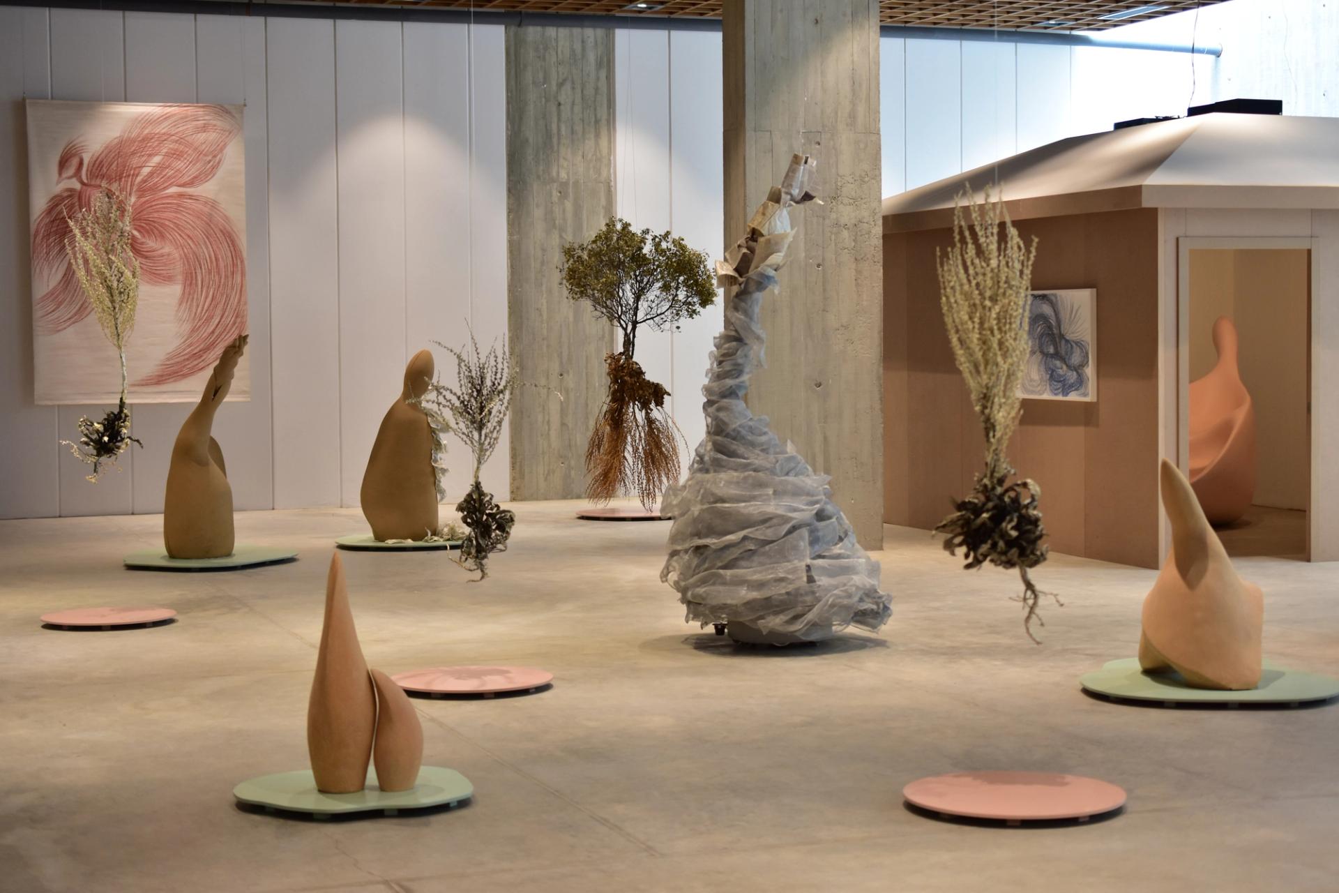 Aslan says the artist covered the exhibition’s organisation, which has been shown in different incarnations twice before in Turkey. The bulk of the work, including twin kinetic statues sprouting tufts of newspaper pages, charcoal paintings of birds, mullein plants dipped in silver and suspended from the ceiling and acrylic-on-felt paintings, occupies a small gallery for temporary exhibitions.