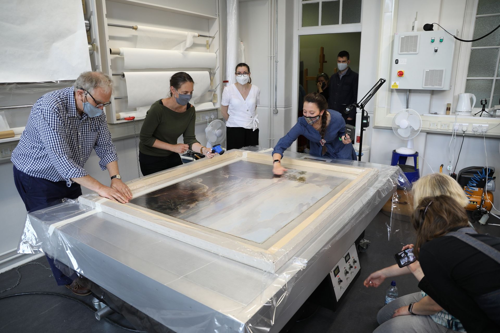 Conservators using an earlier formulation of Beva 371 in 2021 to line the 19th-century painting View of Cape Townshend taken from Mount Westall, March 1802, by William Westall at the Royal Museums Greenwich in London National Maritime Museum, Greenwich, London