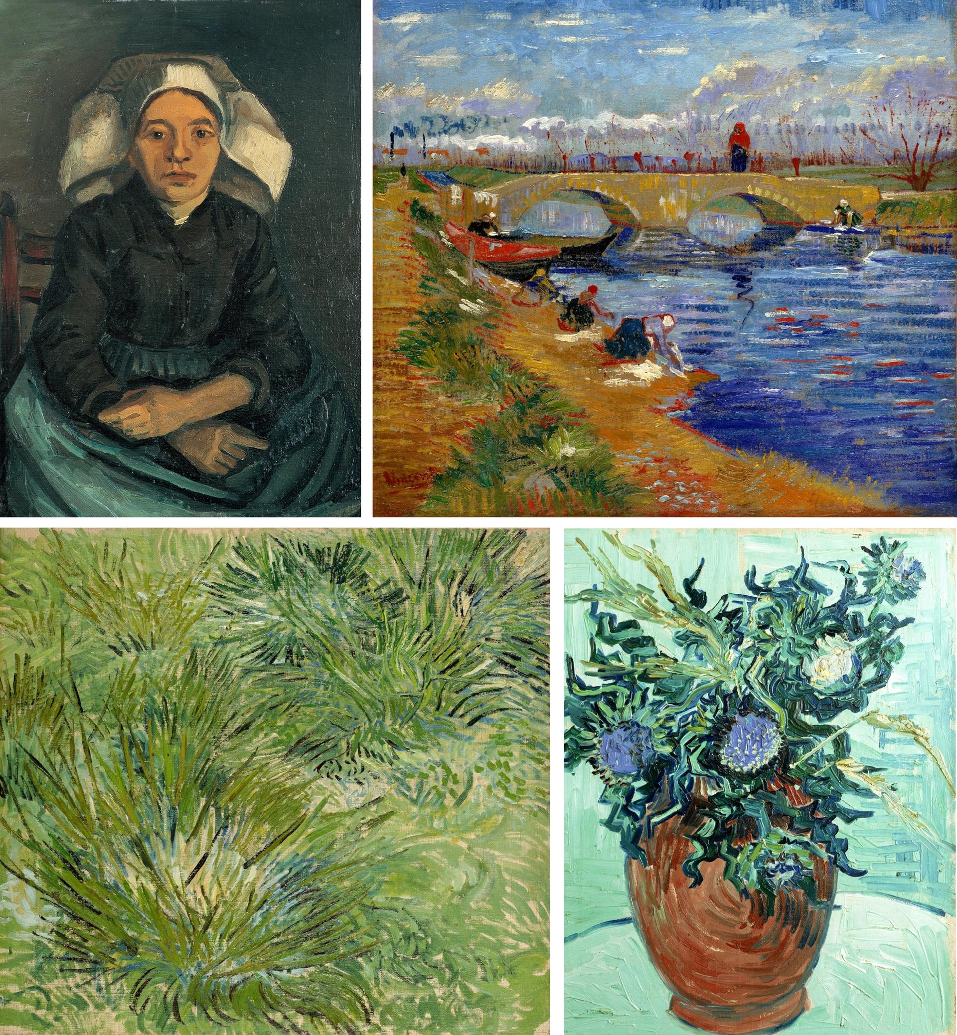 Van Gogh’s Peasant Woman (December 1884-January 1885), The Gleize Bridge over the Vigueirat Canal (March 1888), Clumps of Grass (April 1889) and Flower Vase with Thistles (June 1890)