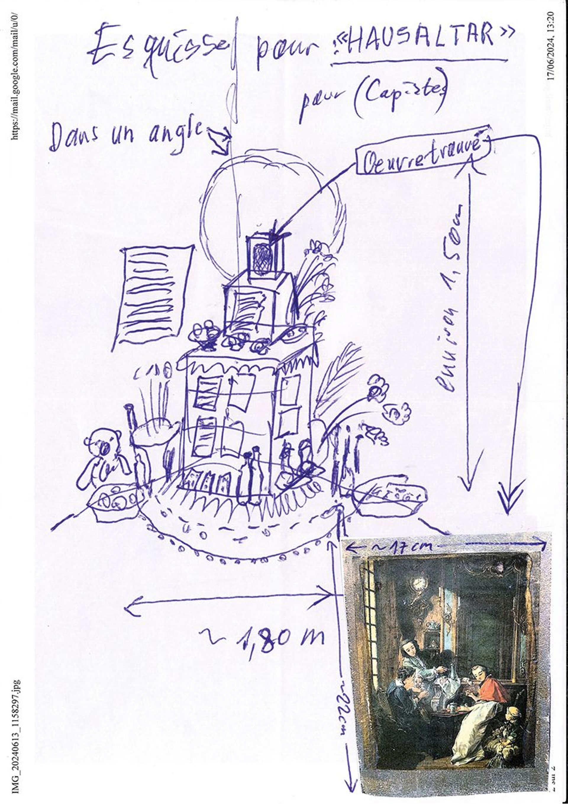 A sketch for Thomas Hirschhorn’s sculptural work Hausaltar, inspired by Boucher’s Le Déjeuner (inset)