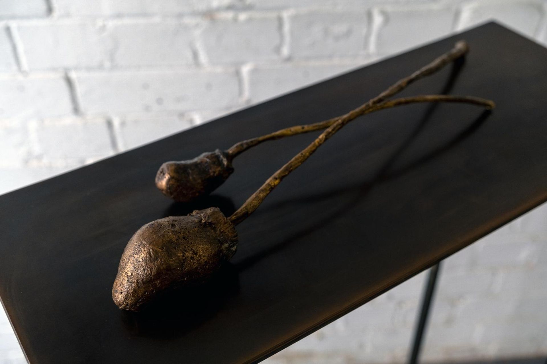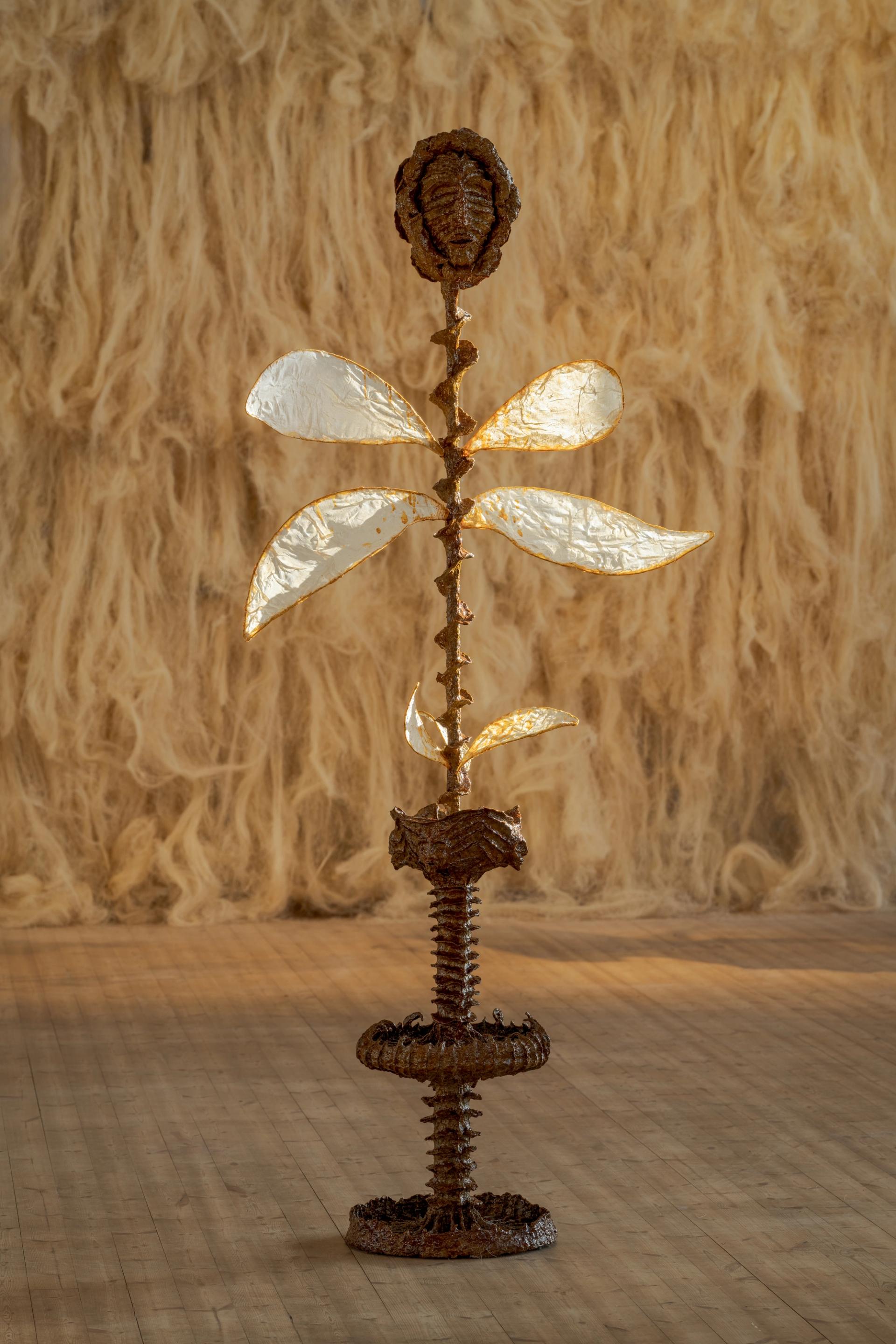 Born in Mauritius, which was once home to the famously extinct dodo, Bayjoo’s exhibition is in part a memorial to the many lost species of the Indian Ocean islands that perished as a result of colonial occupation and now only exist in drawings or the greenhouses of botanical gardens. During a recent residency in Thailand, Bayjoo worked with a foundry specialising in statues for temples and using these traditional techniques he reverently casts many of these vanished plants, drawing attention to the plant as well as the human life devastated by colonialism. These lost ecosystems are also depicted in vivid paintings that are further complicated by being draped with white crochet cotton French Lace, a genteel but loaded textile synonymous with plantation slavery and the catastrophic plundering it supported.