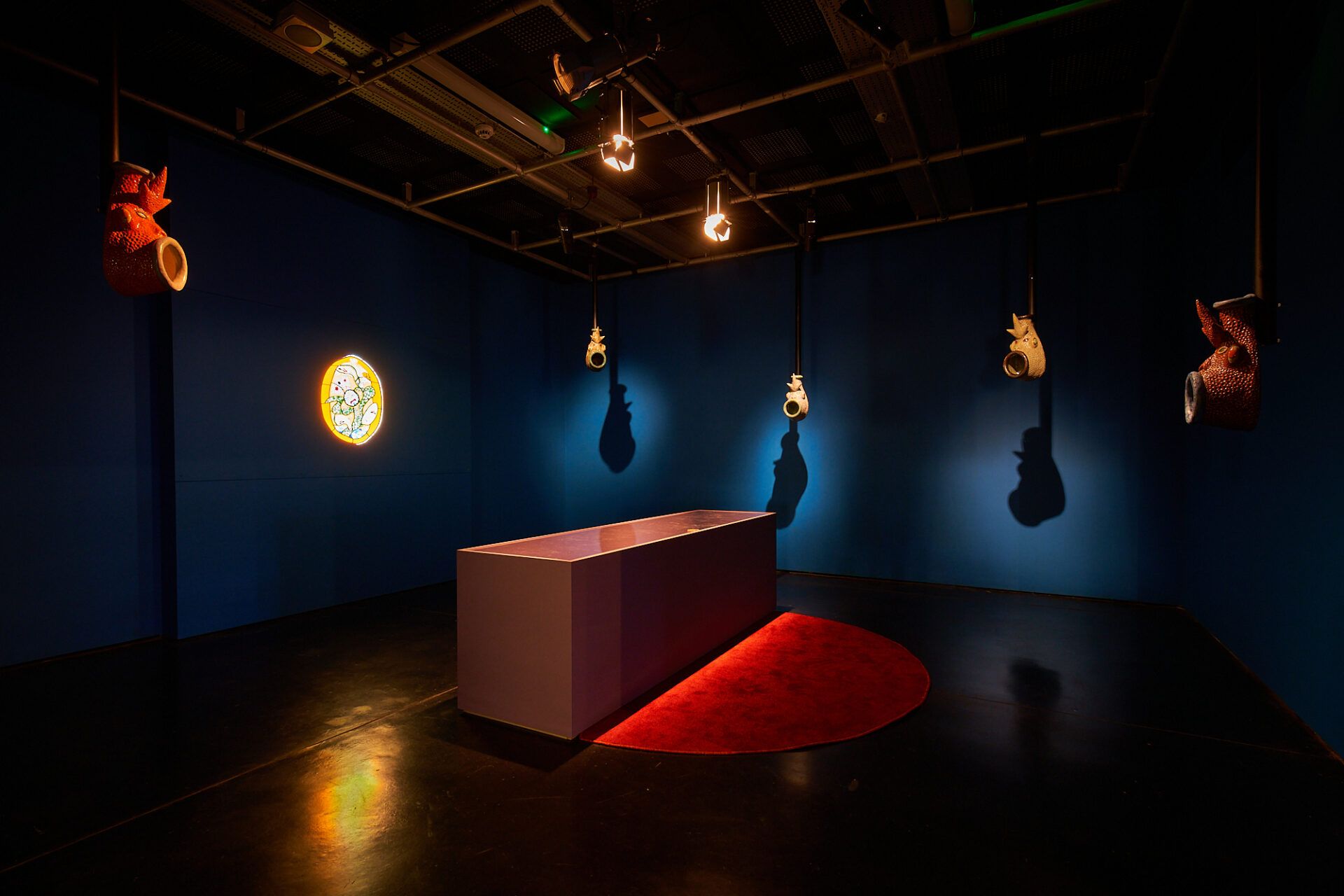 The Glasgow-based British Zimbabwean artist Tulani Hlalo creates an electric blue satin-draped environment reminiscent of a dog show competition tent, as she channels the subculture of competitive dog grooming as an unorthodox means to explore how identity is both defined and mutable, along with the challenges of navigating two different cultures. Four new wall-mounted textile works take the form of hand tufted rugs in the shape of flattened dog pelts, which in turn are bizarrely embellished with images of animal otherness, whether a lobster with a strangely pigmented pink-and-blue carapace or a zebra with spots rather than stripes. One of these ‘grooms’ even takes the form of Björk’s infamous swan dress, once decried but now iconic, while another sports the spangles that recall Hlalo’s own childhood leotard as a competitive gymnast. In an accompanying film, the artist assumes the role of a prize-winning poodle, complete with claws, tail and matching cuffs as well as an oversized rosette—definitely Best in Show…