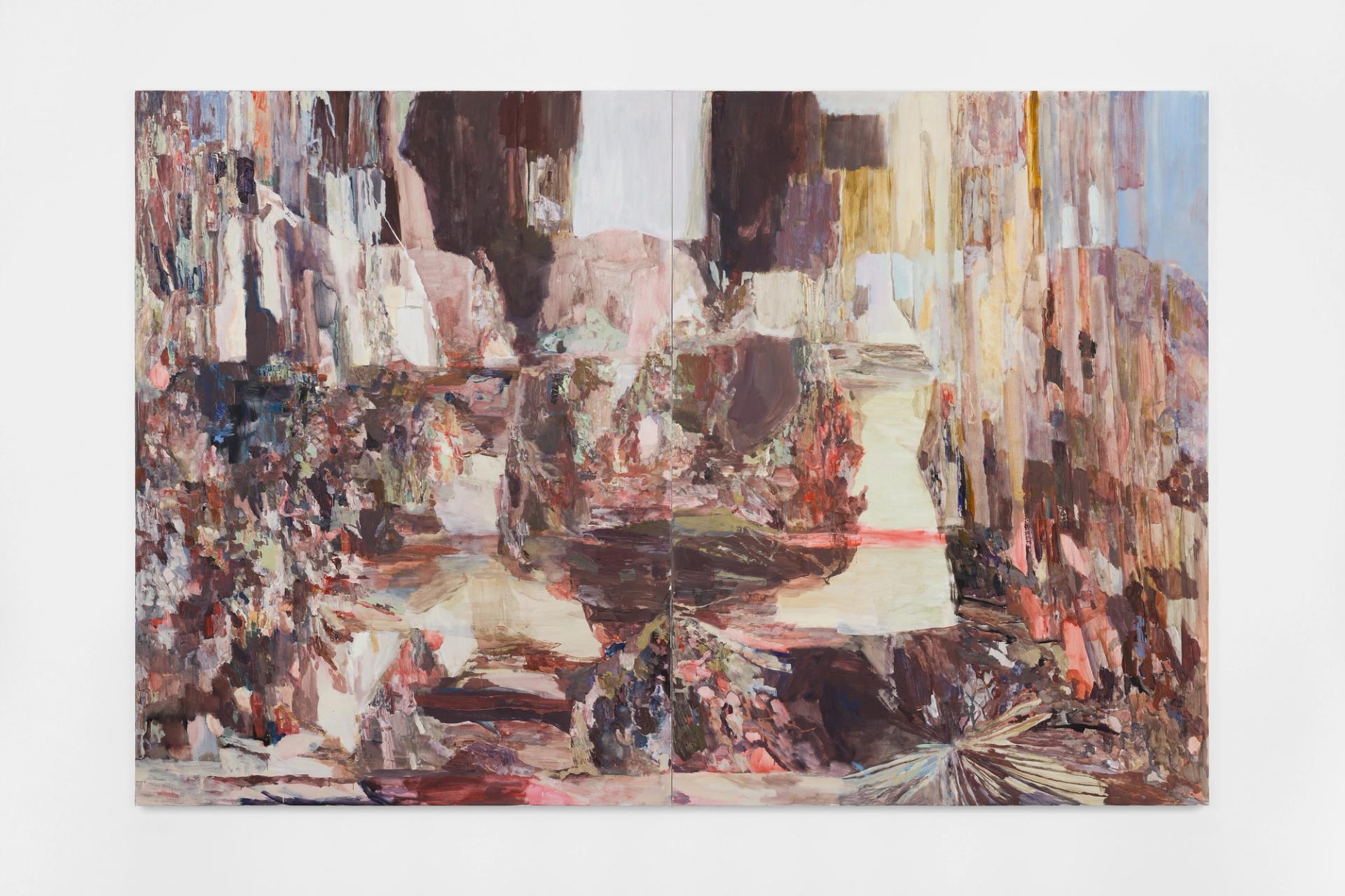 Francesca Mollett makes large-scale abstract paintings that draw on encounters with places—mostly in cities—from a wide range of locations and times. Begun quickly and horizontally using a watery mix of charcoal, acrylic and diluted oil paint that is allowed to spread across the surface of the canvas, they are then painstakingly reworked, with specific passages wiped or accentuated, similar to how a writer might hone certain passages of text to reach a precise idea. In this new body of work, which also marks Mollett’s first solo show at the gallery, each painting has informed the next and been developed in sequence, according to how they communicate with each other.