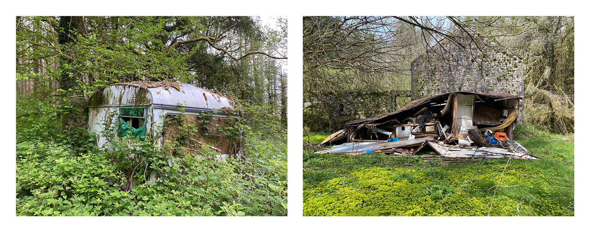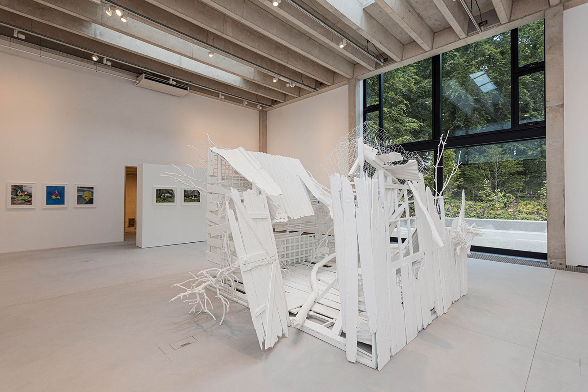 The finished chromogenic prints are presented in pairs, encircling the brilliant white, shed-sized sculpture, Doppelgänger (2020-21), a representation of structural collapse in corrugated iron, beech, pine and oak. A pair of photographs of a rusting caravan consumed in undergrowth and a collapsed house whose sagging roof is kept up only by a full-height refrigerator, are nicely placed directly opposite Doppelgänger and its caved-in corrugated iron roof. Whiteread, speaking to Gallagher for a catalogue interview, reflects on the sense of discord that exists both in her sculptures and her photographs. “Discord is part of life and we are living in a period of history that is far from harmonious,” she says. “But nature always has the capacity to be destructive and yet somehow eventually heals the earth.”