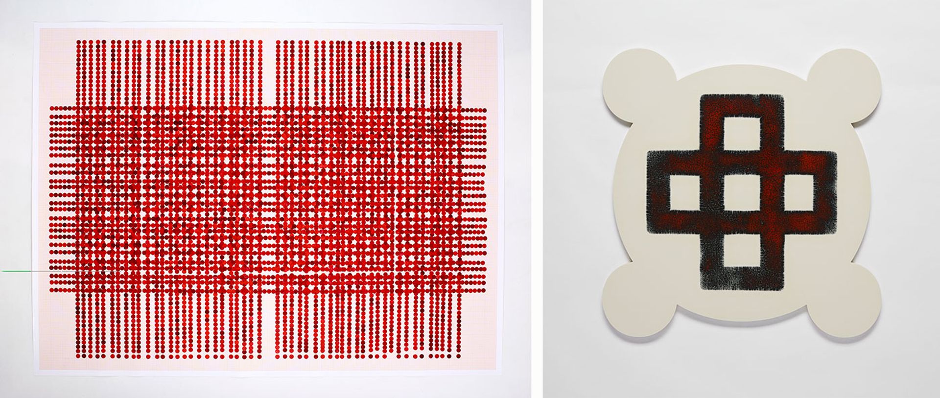 Two pieces by Lubna Chowdhary on show in the foundation's 24 café: Series 4: Number 2 (2022), left, and Marker 62 (2023) Courtesy of the artist and Jhaveri Contemporary