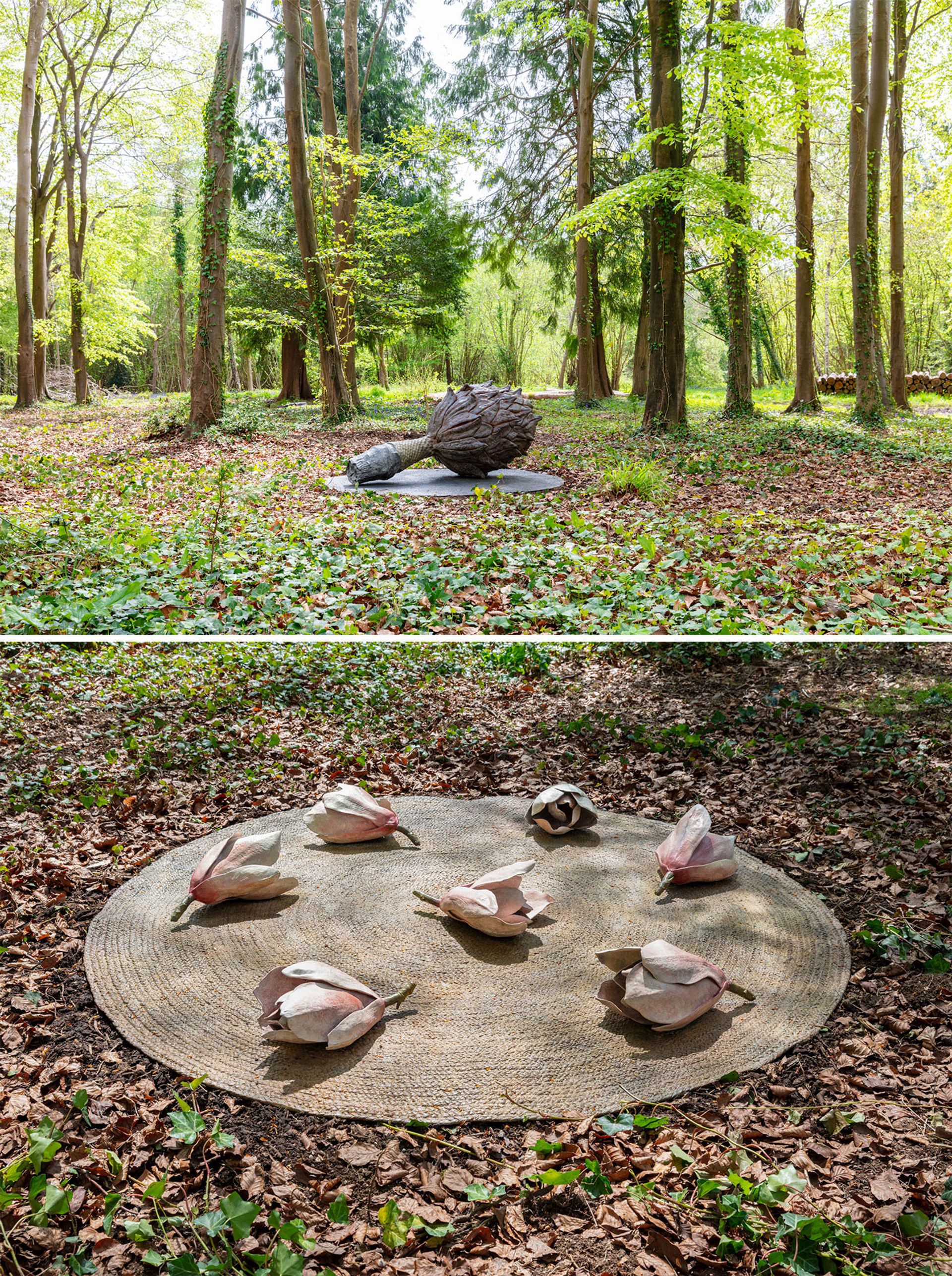 Veronica Ryan, Untitled (Magnolia Pod) (2024, top) and Magnolia Blossoms (2025) in the upper woodland at Goodwood Art Foundation © Veronica Ryan. Photo by Lucy Dawkins, courtesy Goodwood Art Foundation. Magnolia Pod, Collection of Lorenzo Legarda Leviste and Fahad Mayet