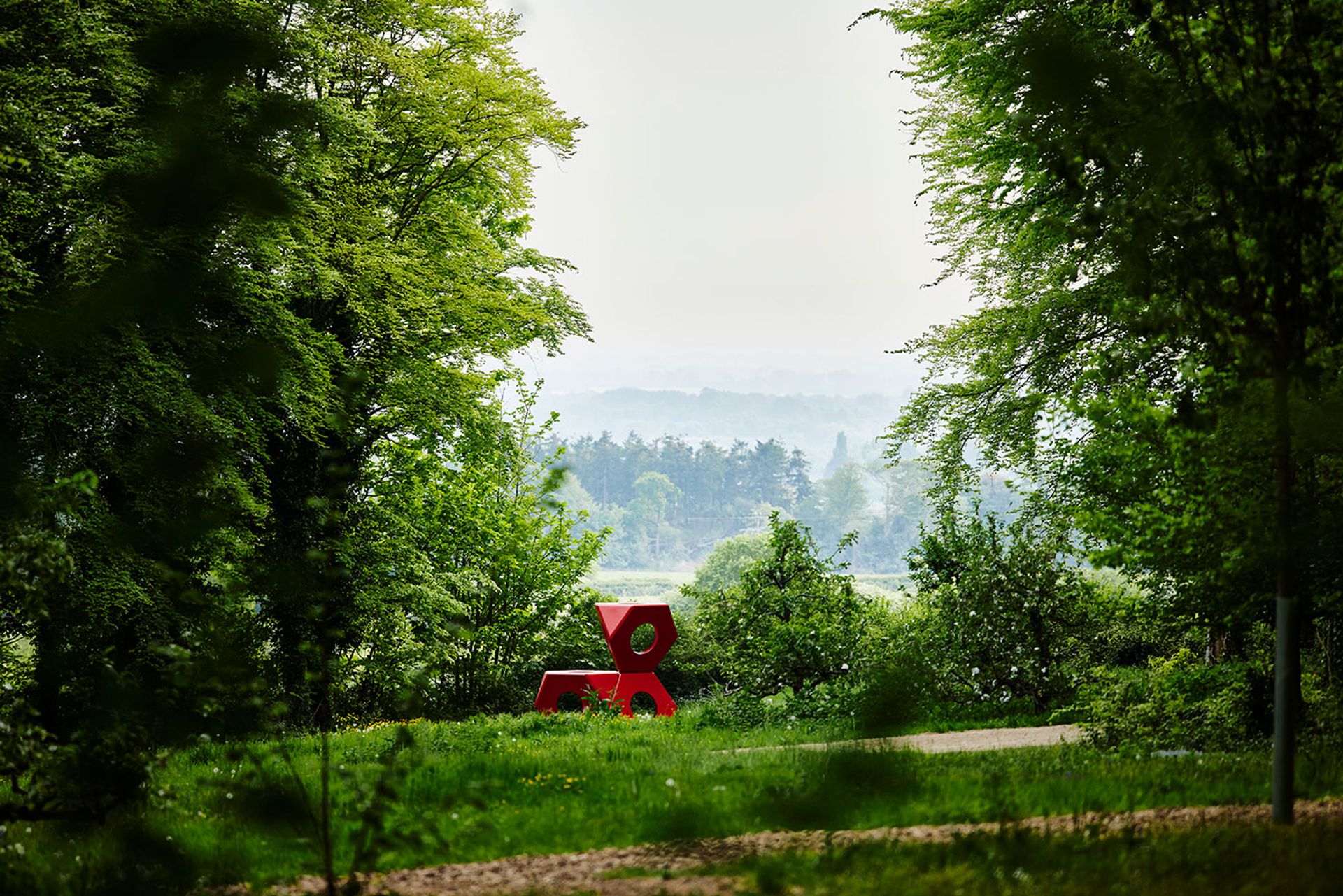 At the south margin of the main plantation, at its border with the meadow, openings have been made to present the warm blancmange-blush-painted bronze of Wylie’s jaunty Pale Pink Pineapple/ Bomb (2025) and the vivid poppy red of Noguchi’s Octetra (three-element stack) (1968/2021). The pigments of both pieces “pop” against the surrounding green and a theatrical backdrop of hedgerow-lined farmland spread across Prussian-blue hills.