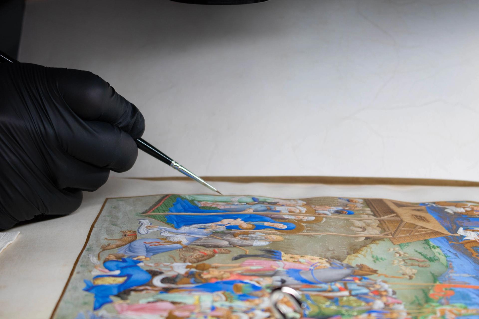Moreover, owing to the fragility and preciousness of the illuminations, the Très Riches Heures have not been shown to the public for decades. But the centuries-old binding and some of the paint surfaces have been subject to a painstaking conservation project, allowing the famous full-page calendar paintings to be temporarily detached and put on view.