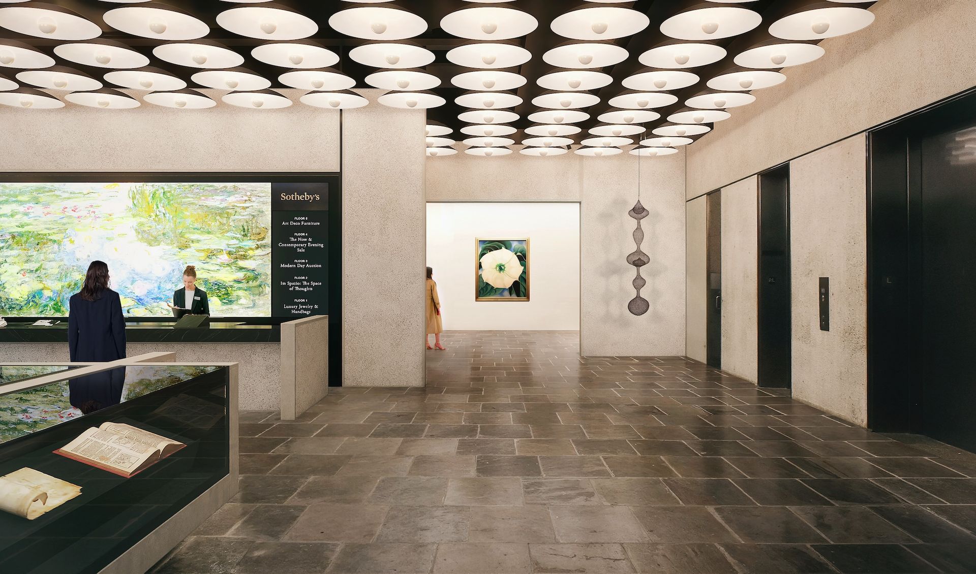 A rendering of Sotheby's lobby and ground-floor gallery at 945 Madison Avenue; this rendering includes a reproduction of Georgia O’Keeffe's Jimson Weed/White Flower No. 1 (1932), which will not be on view on Sotheby’s Courtesy Sotheby's. Ruth Asawa: Artwork © 2025 Ruth Asawa Lanier, Inc., Courtesy David Zwirner. Georgia O’Keeffe: © 2025 Georgia O'Keeffe Museum / Artists Rights Society (ARS), New York