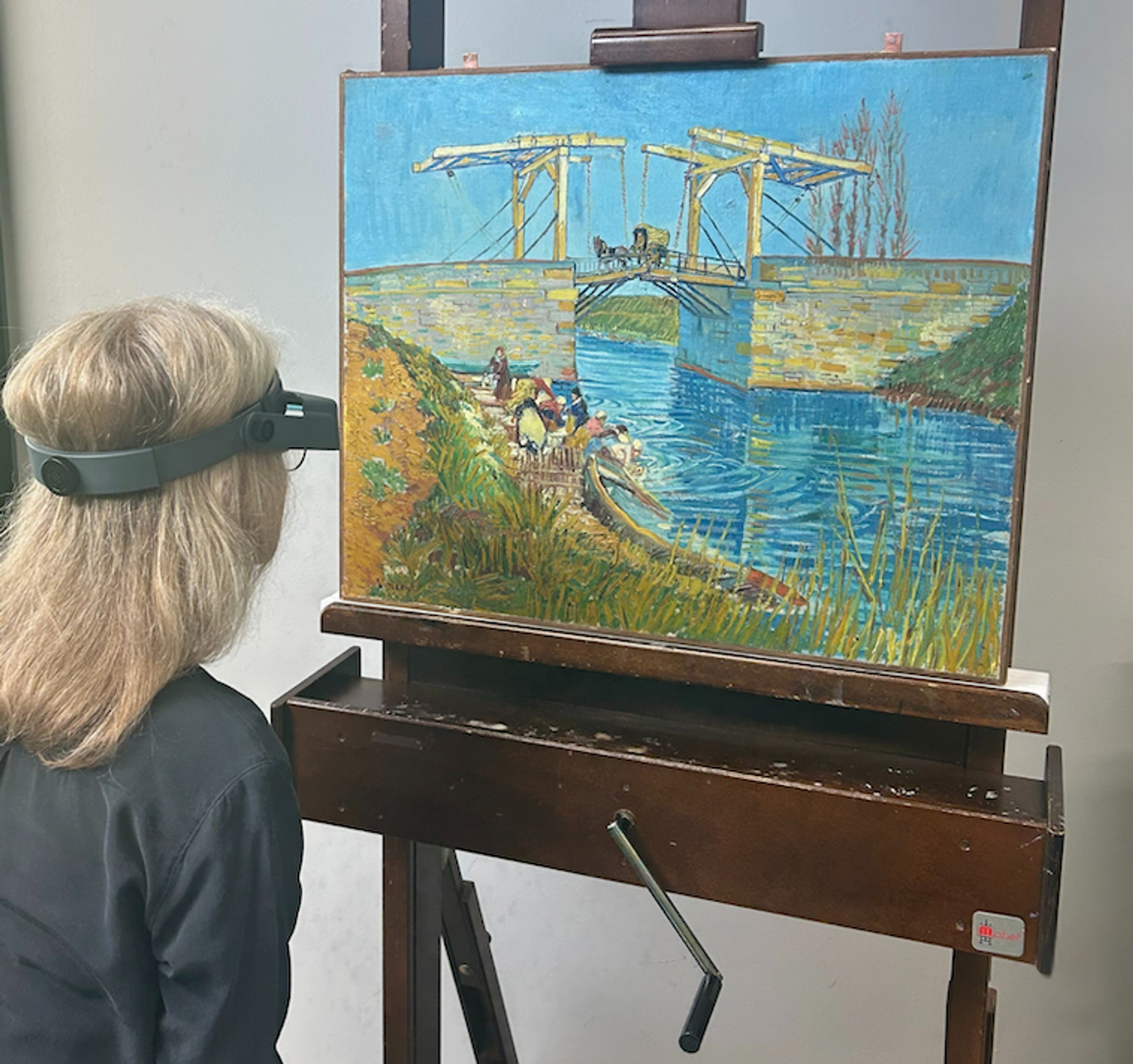 Conservator Margje Leeuwestein examining Bridge at Arles at the Kröller-Müller Museum
