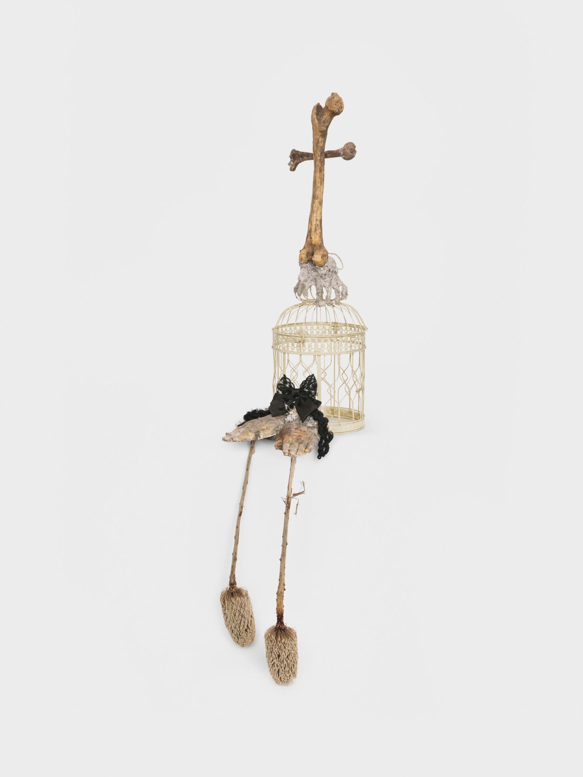 This sculpture is one of a collection of brand new works paying tribute to motherhood that the artist created specially for the exhibition. Whether hanging from the wall, sitting on a pedestal or lying on the floor, Pottinger’s humanoid reliquaries find familiarity in the seemingly unknown, braiding disparate narratives together into talismans. There is a flux to these sculptures, a sense that their “becoming” could happen at any moment and in any anarchic fashion. Part of this tension lies in Pottinger’s penchant for line—originally trained in drawing, not in sculpture, she developed a highly personal, speculative procedure for her duppies, lending them a singular, haunting quality.