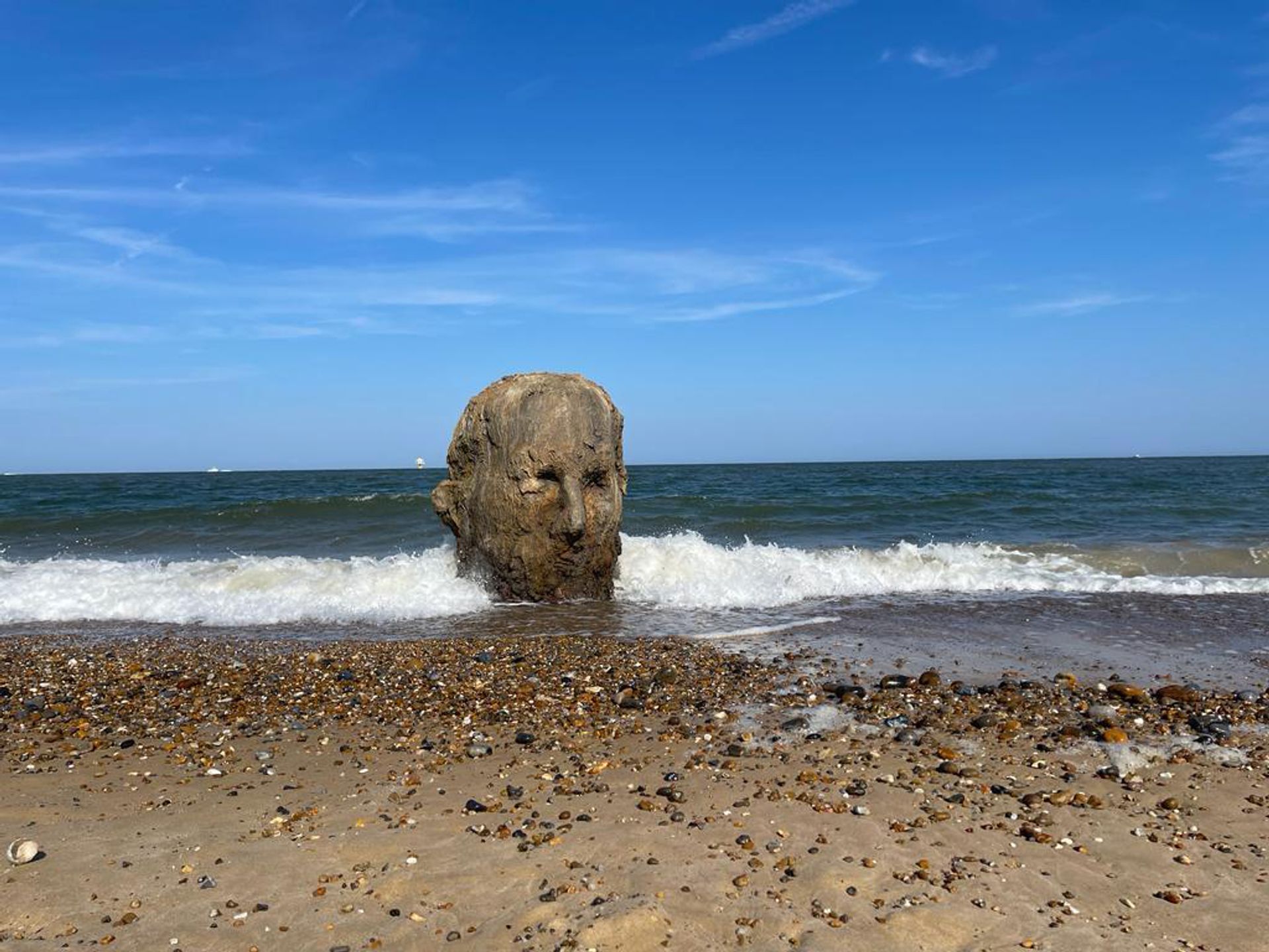Laurence Edwards’s Large Chthonic Head (2023), a temporary installation on the beach at Lowestoft, in Suffolk,organised by Messums in 2023. This summer’s Sculpture in the Sands exhibition also featured work by Edwards © The artist; courtesy of Messums