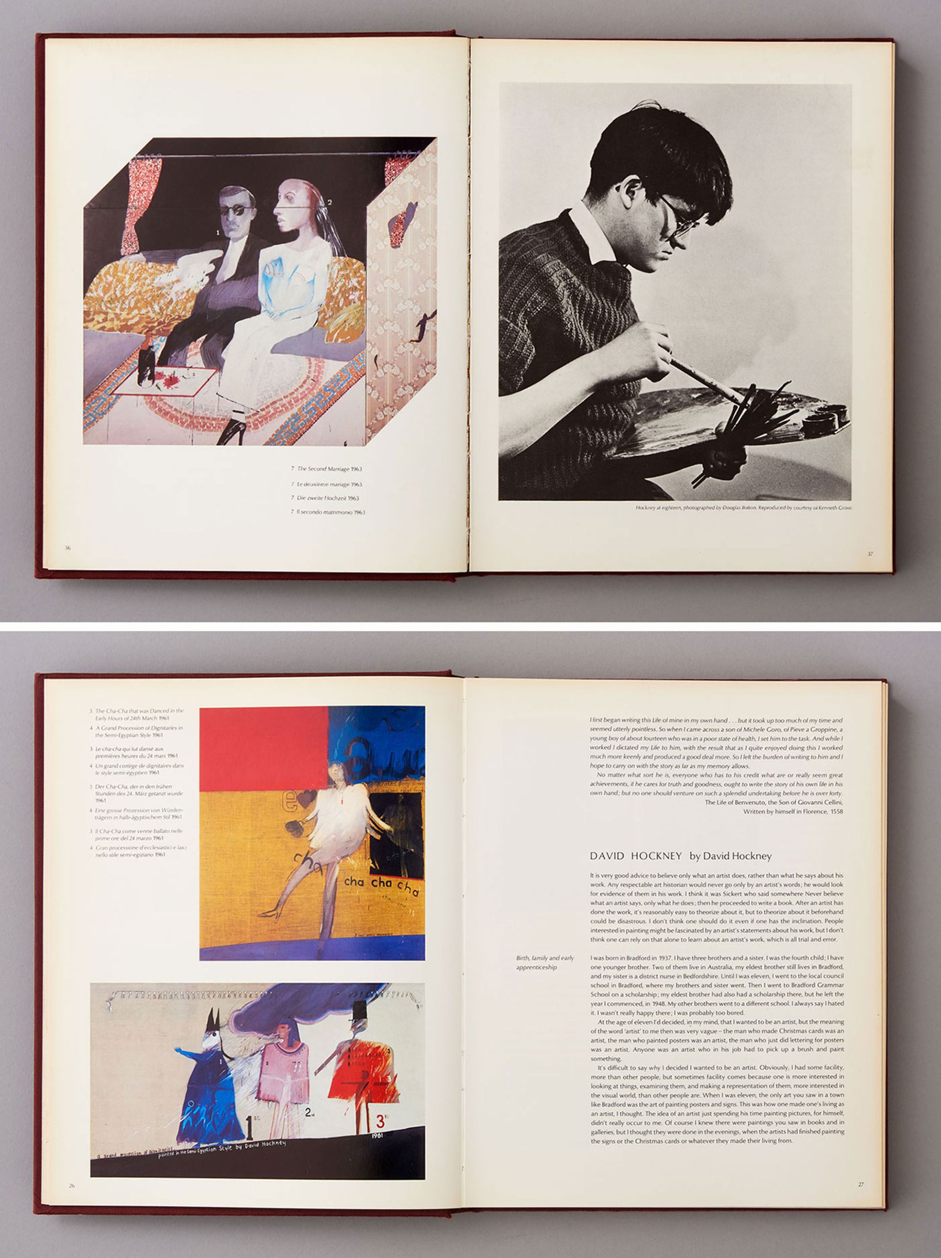 A concern for the integration of text and images: two double-page spreads from David Hockney by David Hockney (1976), edited by Nikos Stangos and published by Thomas Neurath and Thames & Hudson Copyright David Hockney / Thames & Hudson