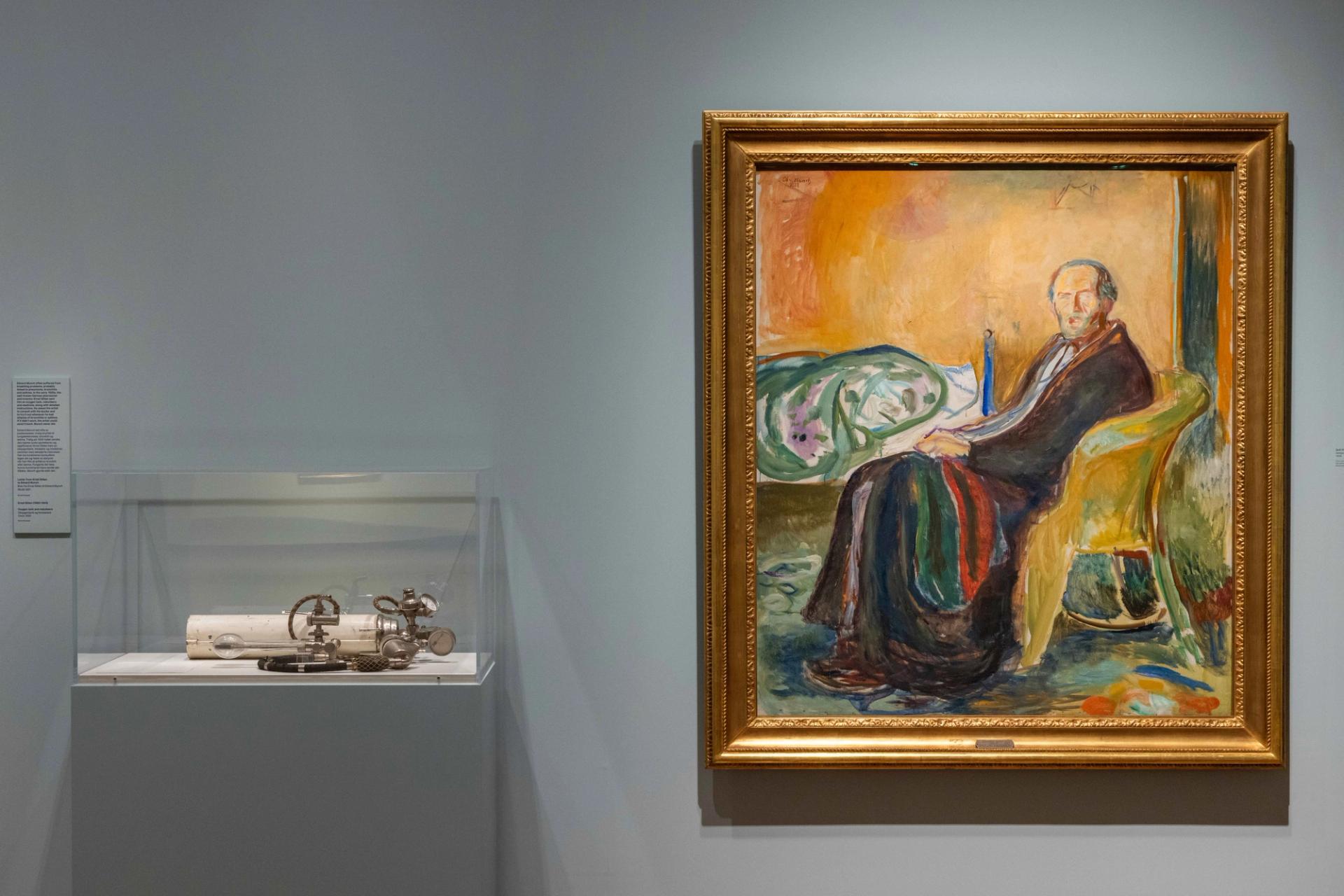 Installation view of Edvard Munch: Lifeblood showing Munch’s Self Portrait with the Spanish Flu of 1919 beside a case containing his breathing equipment