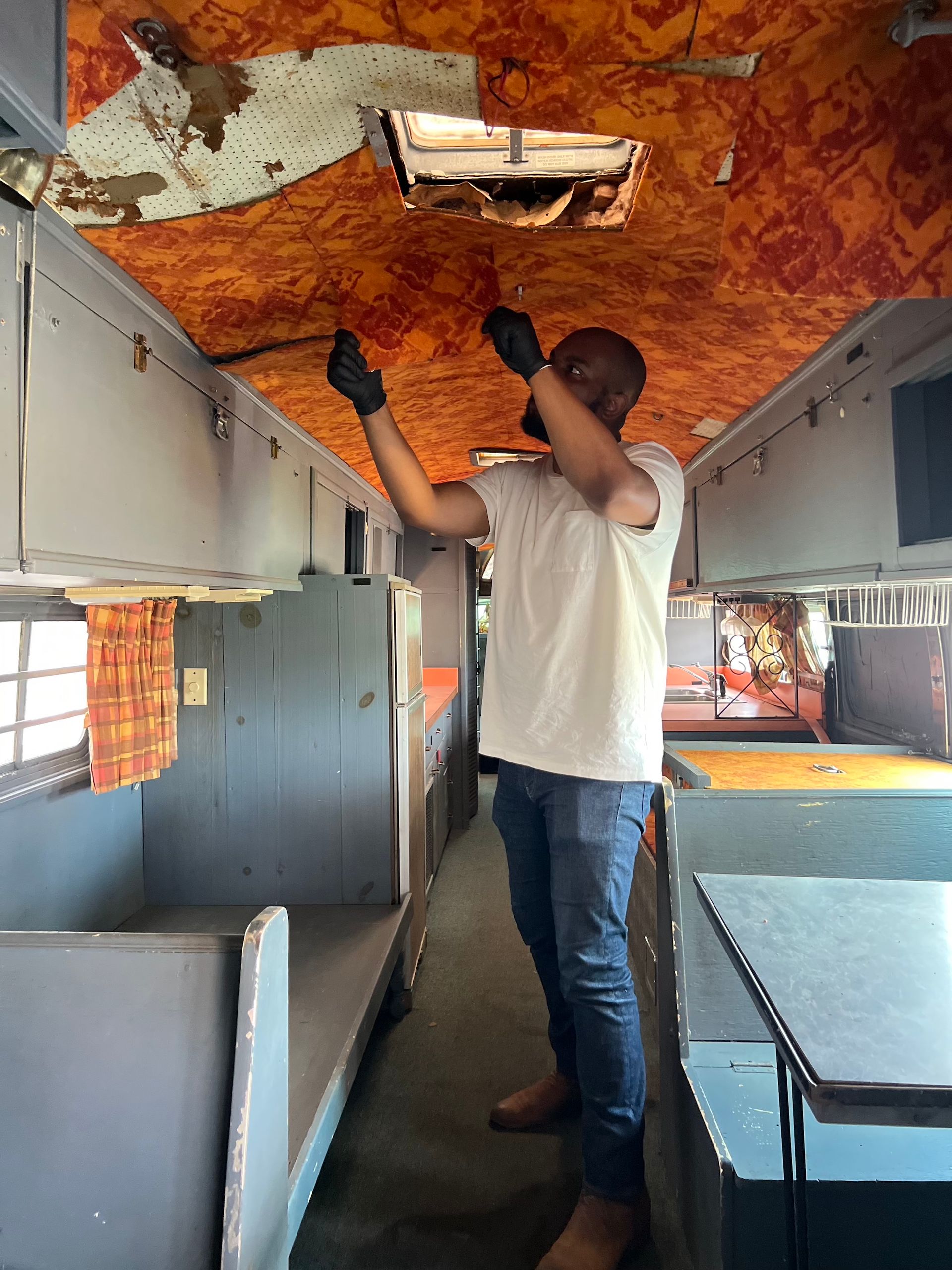 Edwards gutting the bus’s interior—it had been turned into a home on wheels in the 1970s Photo: Leo Michael Nash