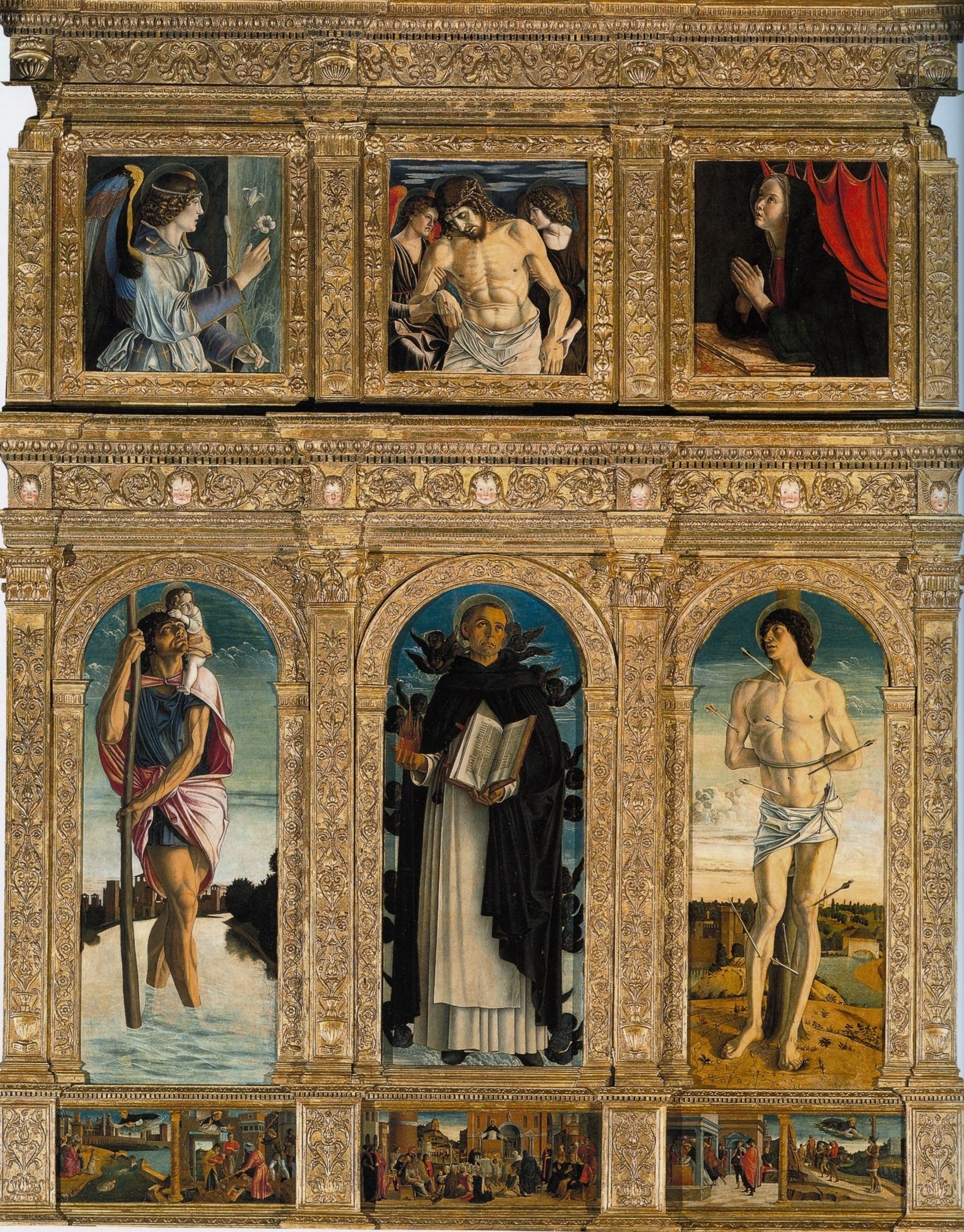 Known locally as Zanipolo, this spectacular Dominican church lost a great Bellini altarpiece in a fire in the 19th century. But this early polyptych survived and is still preserved in its original frame, which is only missing a lunette from the top. The nine panels are organised around a depiction of Vincent Ferrer, a Dominican saint from Valencia who had been canonised only about ten years previously. He is flanked by Saint Christopher and Saint Sebastian with an annunciation and a dead Christ above. There is a sense of monumentality to these figures, but not yet of the coherence and unity of composition that was to come. (The three-part predella is probably not by Bellini).