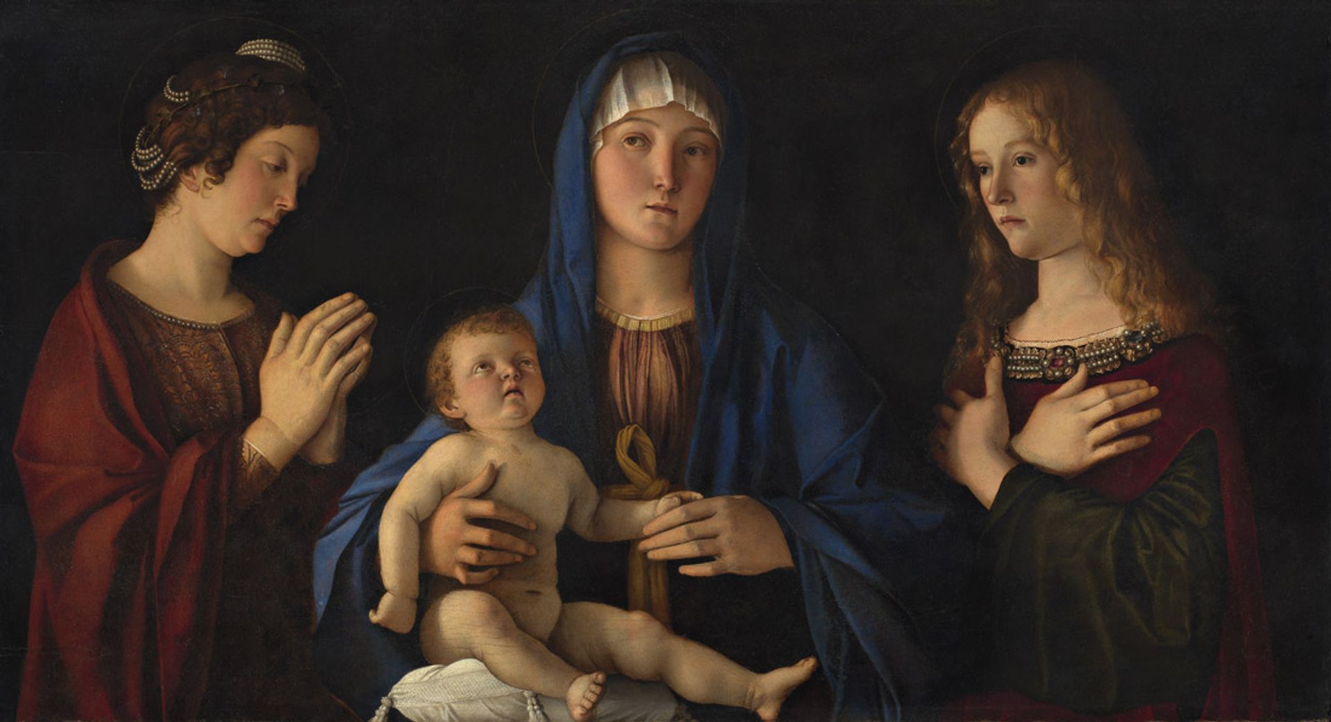 Another sacred conversation, this time between the Virgin and Child and two saints: Catherine of Alexandria (left) and a young Mary Magdalene. There is no architectural or landscape setting here, simply a darkened background like that in the Presentation at the Temple. The faces of the three young women seem to shine in candlelight, or perhaps it is a celestial glow, which predates Caravaggio’s chiaroscuro by a century. Made for private devotion, the saints may be portraits of the patrons; given Bellini’s status they would have been from a leading patrician family.