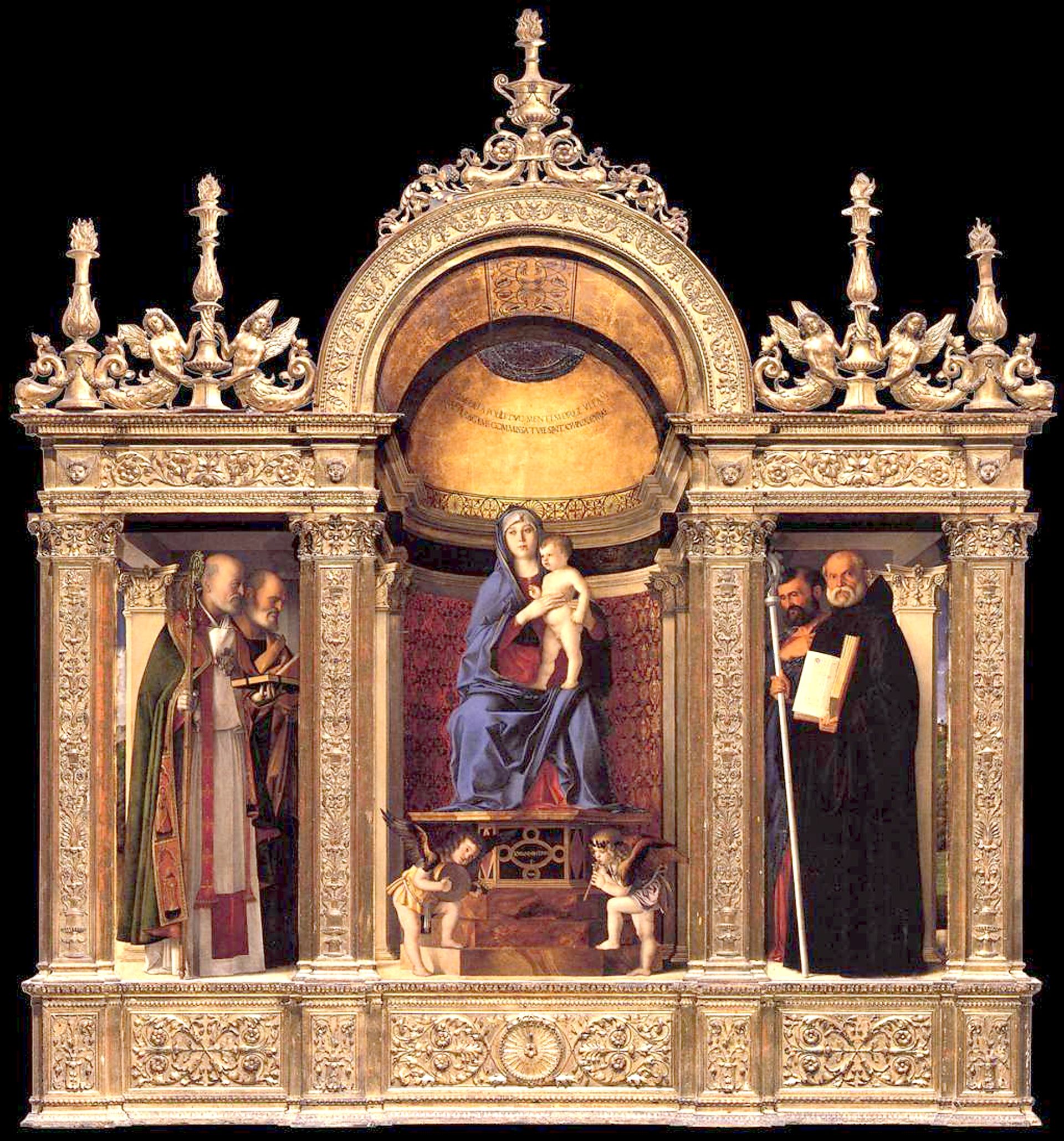 This monumental painting—it is 4.7m tall—is Bellini’s first-known sacra conversazione (sacred conversation) in which an enthroned Madonna and Child commune silently with a company of saints in the same pictorial space. In this case they are Saints Francis, John the Baptist and Job (the titular Giobbe, in Italian) to the left of the Madonna, and Dominic, Sebastian and Louis of Toulouse to her right. Bellini sets the figures not against a traditional landscape but within a fictive architectural setting—including a canopy suspended in the space between the Virgin and viewer—designed to reflect its location in the church for which it was commissioned (the Chiesa di San Giobbe). He also suggested a celestial soundtrack provided by three musician angels.