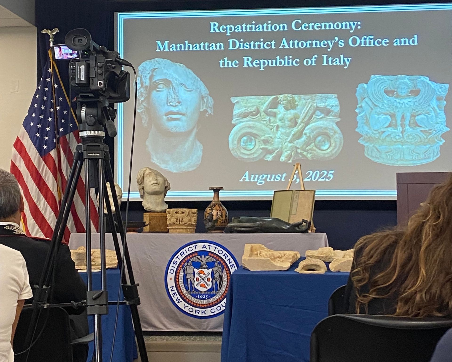 The ancient marble bust alongside other objects being returned to Italian authorities in a repatriation ceremony in Manhattan on 5 August Courtesy Leila Amineddoleh