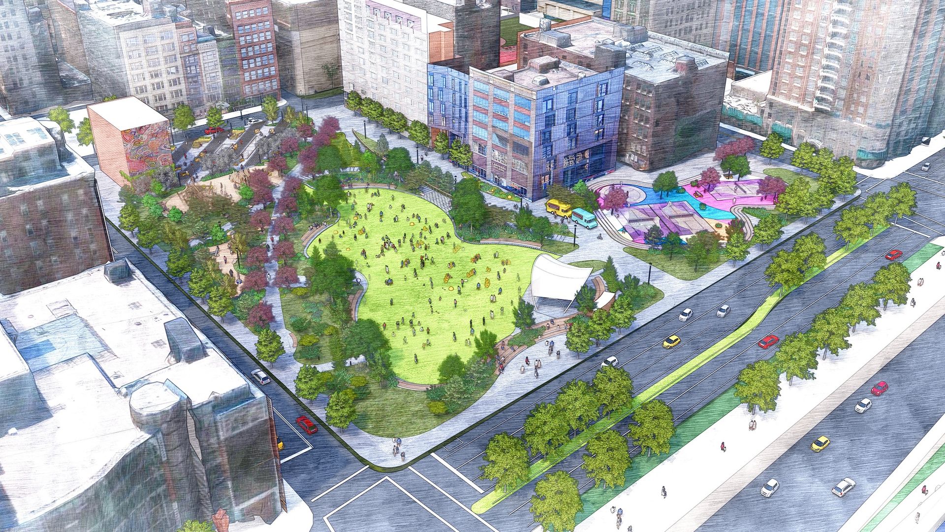 The New York-based landscape architecture firm Field Operations, best-known for projects like the High Line and Brooklyn’s Domino Park, will spearhead Arts Landing with an emphasis on native and sustainable plants. One acre of the site will contain a lawn that slopes downwards to a permanent bandshell with views of the Allegheny River and the Three Sisters bridges. There will also be three pickleball courts, the first-ever playground in downtown Pittsburgh, garden trails and a visitor centre.