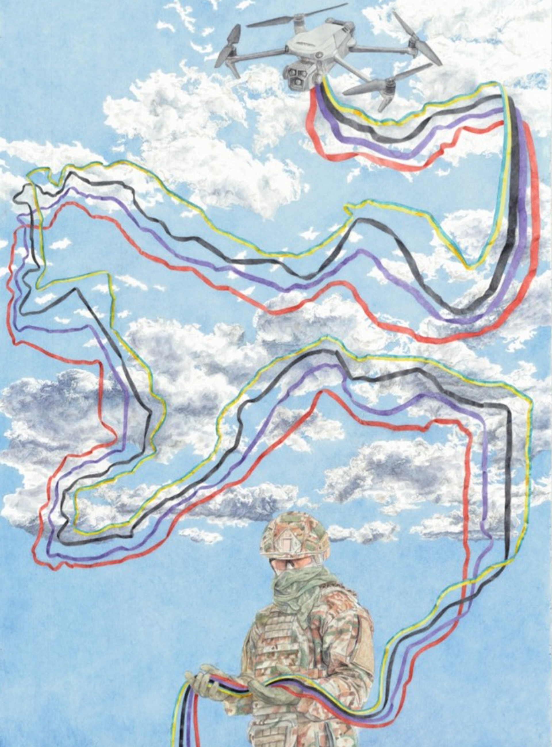 Chichkan shared this work to Instagram in 2024, with the caption “anarchic and anti-authoritarian left drones”