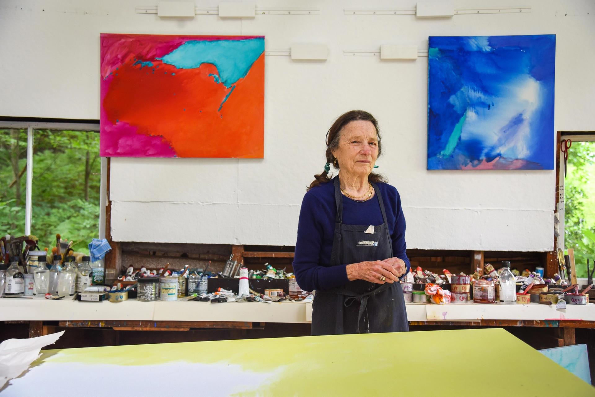 Mason in her studio in Brattleboro, Vermont, with the work in progressThin Ice (2018)