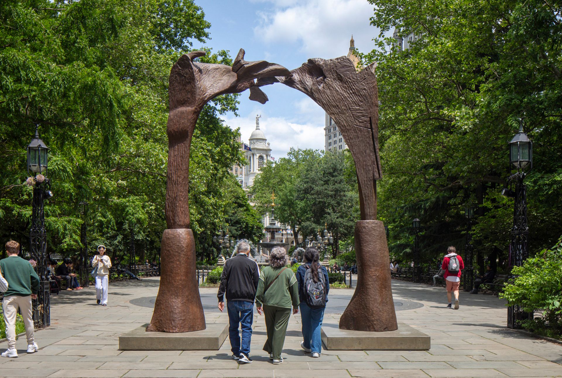 Wish you wood: a group of massive bronze sculptures cast from carved wood by the nonagenarian sculptor Thaddeus Mosley is on view at City Hall Park, adding monumental, organic forms to a Lower Manhattan landscape dominated by concrete, steel and glass Photo: Nicholas Knight, courtesy of Public Art Fund, New York
