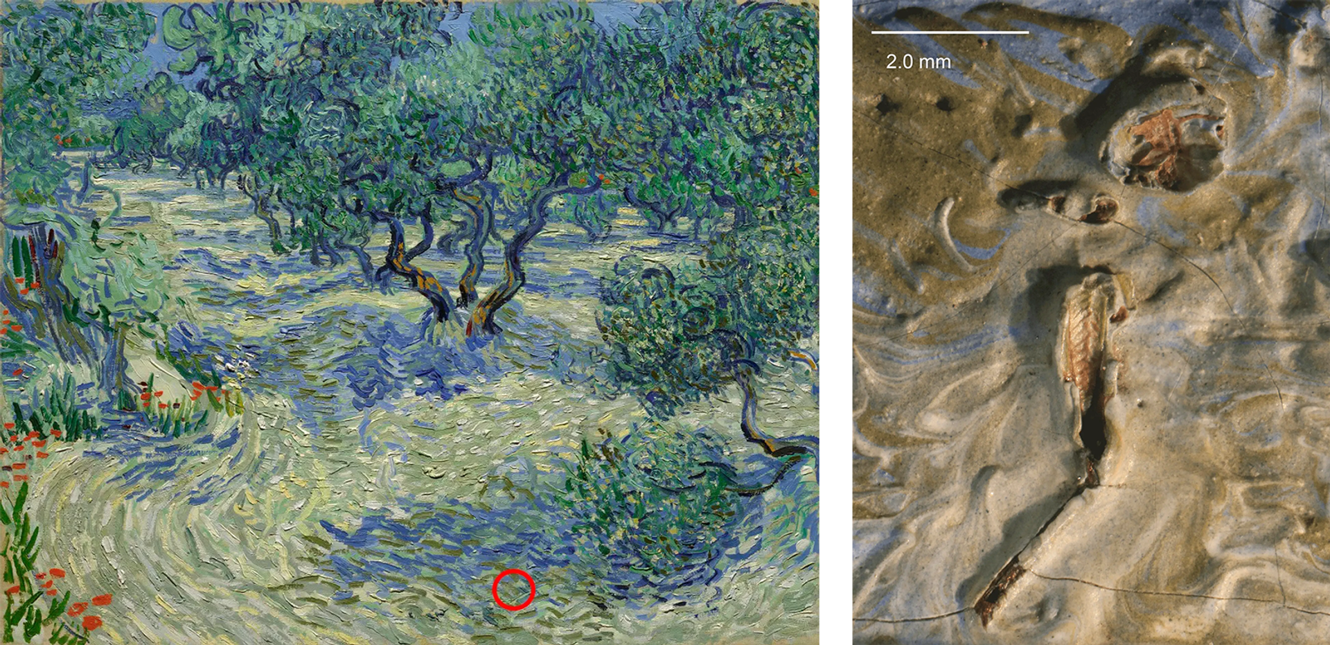 A recent discovery by conservators at the Nelson-Atkins Museum of Art in Missouri confirms that its Olive Trees was painted outside, not in Van Gogh's studio in the asylum at Saint-Rémy-de-Provence. Parts of a grasshopper were found, which must have been blown onto Van Gogh’s wet paint. There was no disturbance to the paint, which would have occurred if a live insect had got stuck, so presumably it must have been dead on arrival.