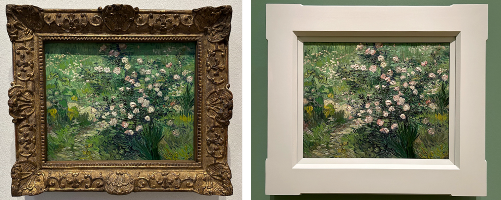 Van Gogh’s Roses (April 1889) in its gilded frame and its current replica Gachet frame