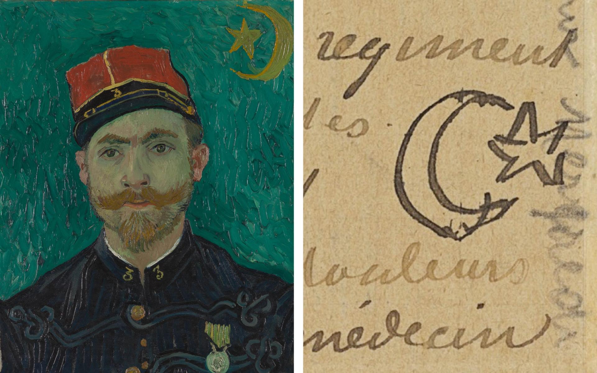 The Lover, one of the pair of portraits which gave the National Gallery's exhibition its subtitle, has lieutenant Paul-Eugène Milliet’s regimental emblem the wrong way around. As the exhibition catalogue explains, the crescent moon should be pointing to the right, not the left. Vincent drew it correctly in a letter to his bother Theo.