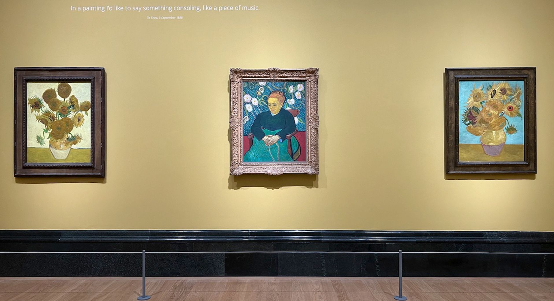 Triptych presentation of the London and Philadelphia Sunflowers (August 1888 and January 1889), surrounding La Berceuse (The Lullaby) (January 1889), from Boston’s Museum of Fine Arts