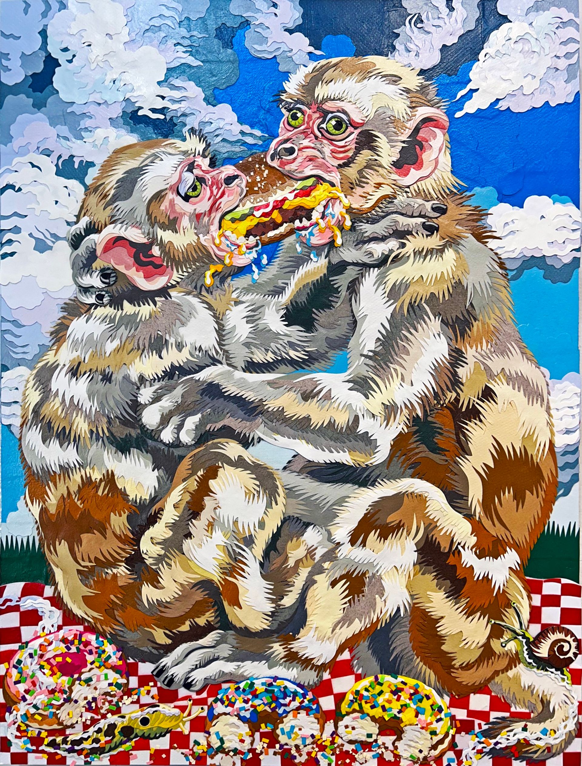 The Oakland, California-based Cindy Lisica Gallery is showing frenetically bestial works by the San Francisco-based artist Andrea Bergen, whose handcut paper depictions of naughty, anarchic critters, dogs, pigeons and raccoons marry precision with boundless excess. In Fun Between Buns (2025), two monkeys go full "Lady and the Tramp" on a cheeseburger, a deviously delicious picture of teamwork incarnate.