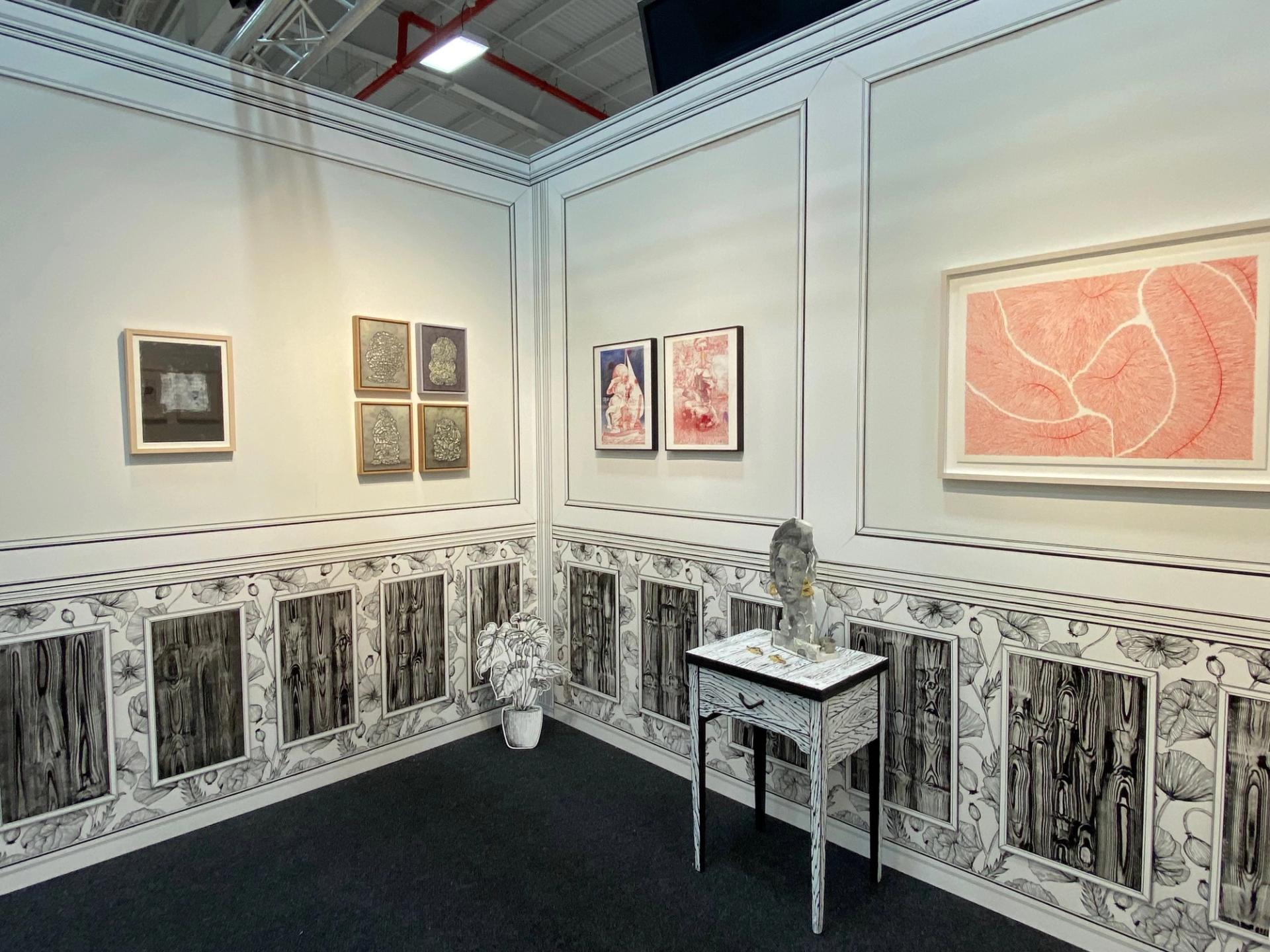 Monira Foundation and Mana Contemporary Art Center's stand at Art on Paper features works by Anne Muntges, Jaouad Bentama, Qinza Najm, Verdiana Patacchini, Shihori Yamamoto, Jonathan Twingley and Kele McComsey Courtesy Monira Foundation and Mana Contemporary Art Center