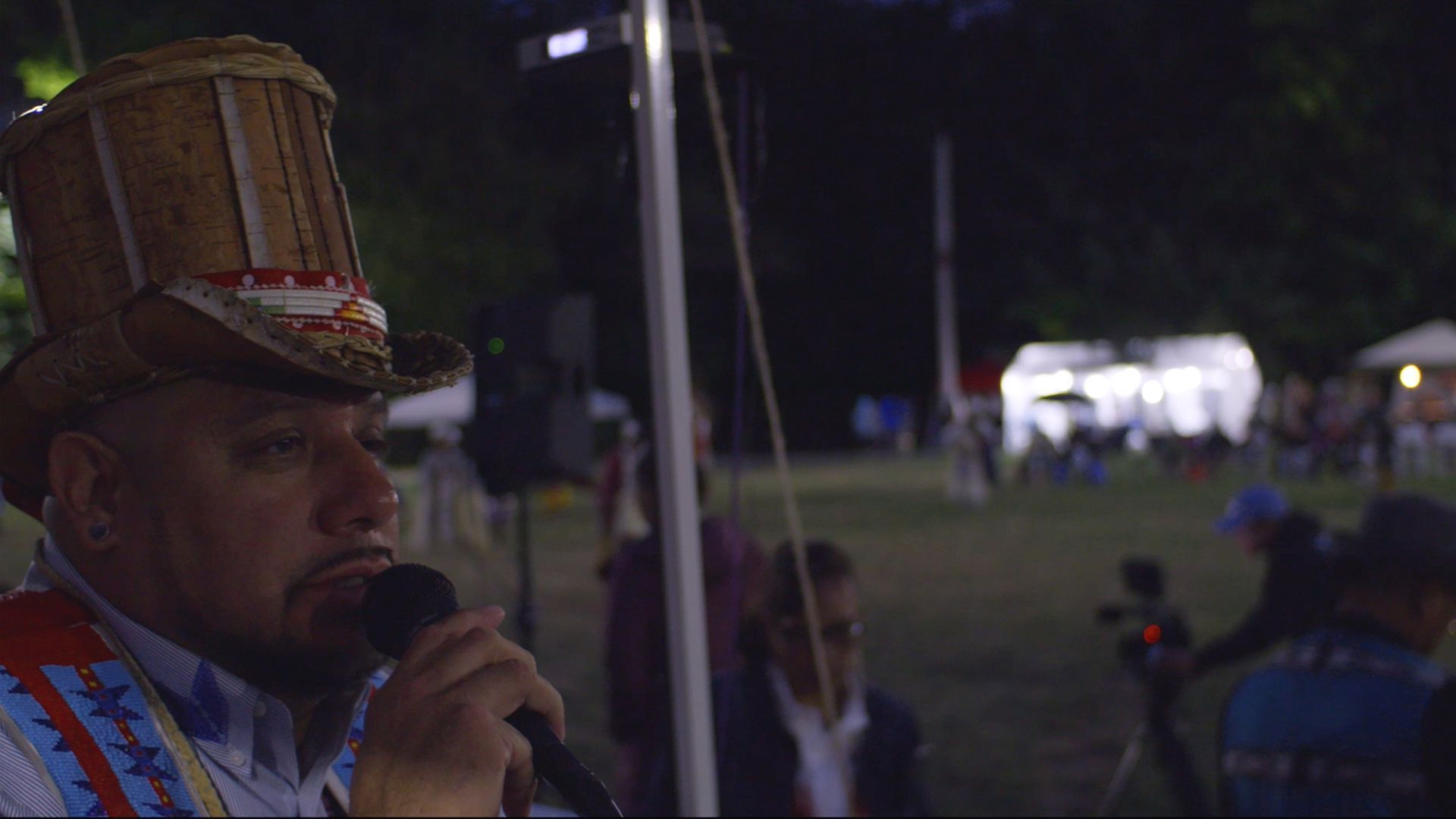Hopinka and his producers arranged the powwow on the grounds of Seattle’s Daybreak Star Indian Cultural Center, inviting singers and dancers known across the powwow circuit for a representative showcase of the performance traditions that developed out of necessity following the forced resettlement of North America’s Indigenous population. Held over three days in August of 2023, the powwow is condensed in the film into a single day, from morning preparations to a climactic dance competition at night.