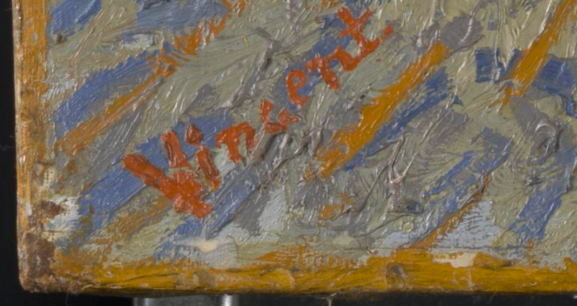 Enlargement of the lower-left corner of Van Gogh’s The Sower, out of its frame, showing the border painted by the artist