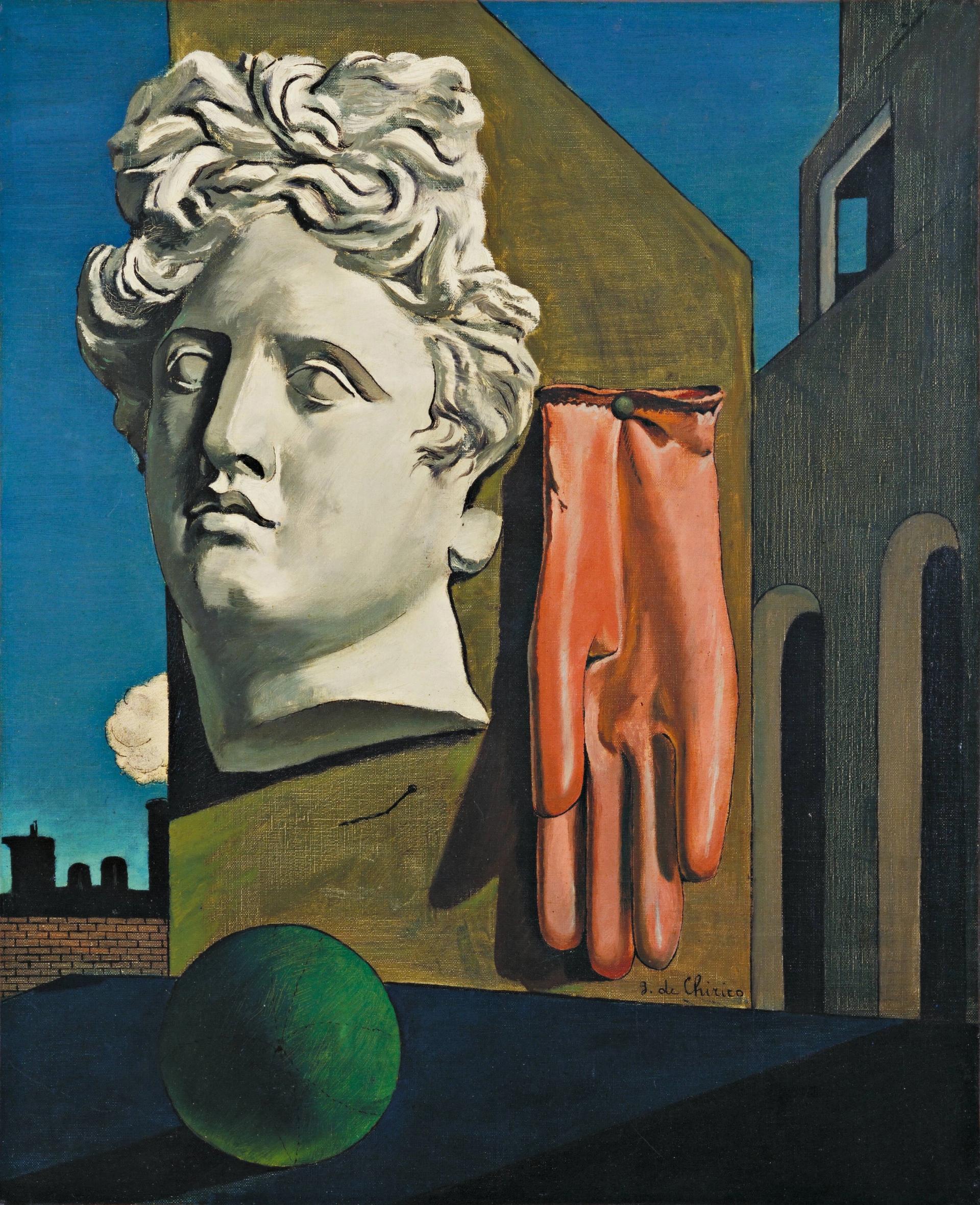 Surrealism was partly defined by the juxtaposition of familiar but unexpected objects in paintings or sculptures, with the intention of provoking unsettling responses in the viewer. In his 1869 poetic novel Les Chants de Maldoror the Compte de Lautréamont (the pen name of Uruguayan French writer Isidore Ducasse) had imagined the “beautiful… chance encounter of a sewing machine and an umbrella on an operating table”, and his ideas became a major inspiration for the Surrealists in the 1920s. Pre-dating the foundation of the movement in 1924 by André Breton, in this work Giorgio de Chirico places a rubber glove, a plaster head copied from a classical statue and a green ball beside a building in a piazza. De Chirico sought out the enduring realities hidden behind outward appearances, and believed that the modern artist must overcome the interferences of “logic and common sense” and “enter the regions of childhood vision and dream”.