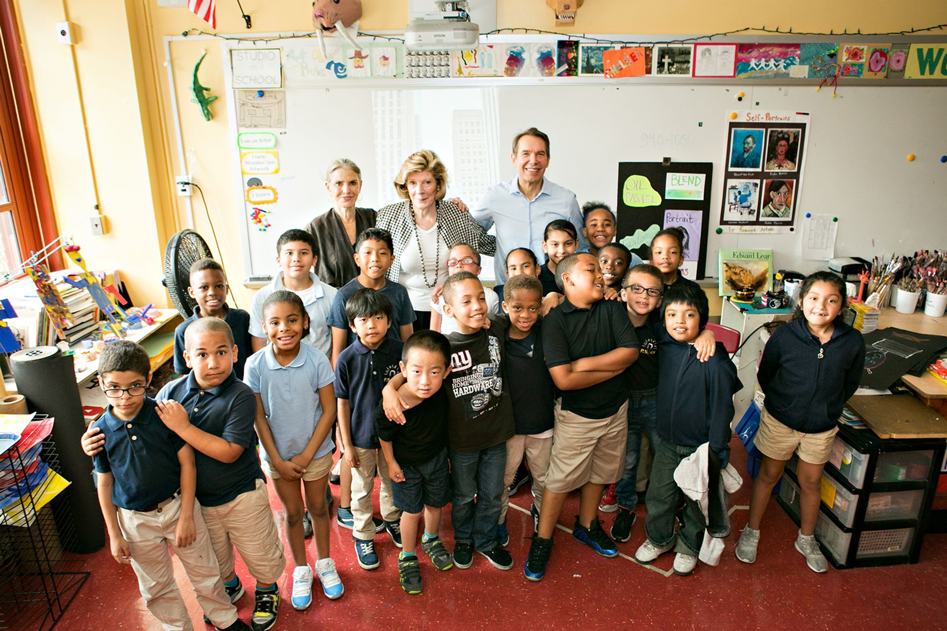Studio In A School artist-instructor Suzanne Stroebe with Agnes Gund, visiting artist Jeff Koons and students at PS145 on the Upper West Side Mindy Best