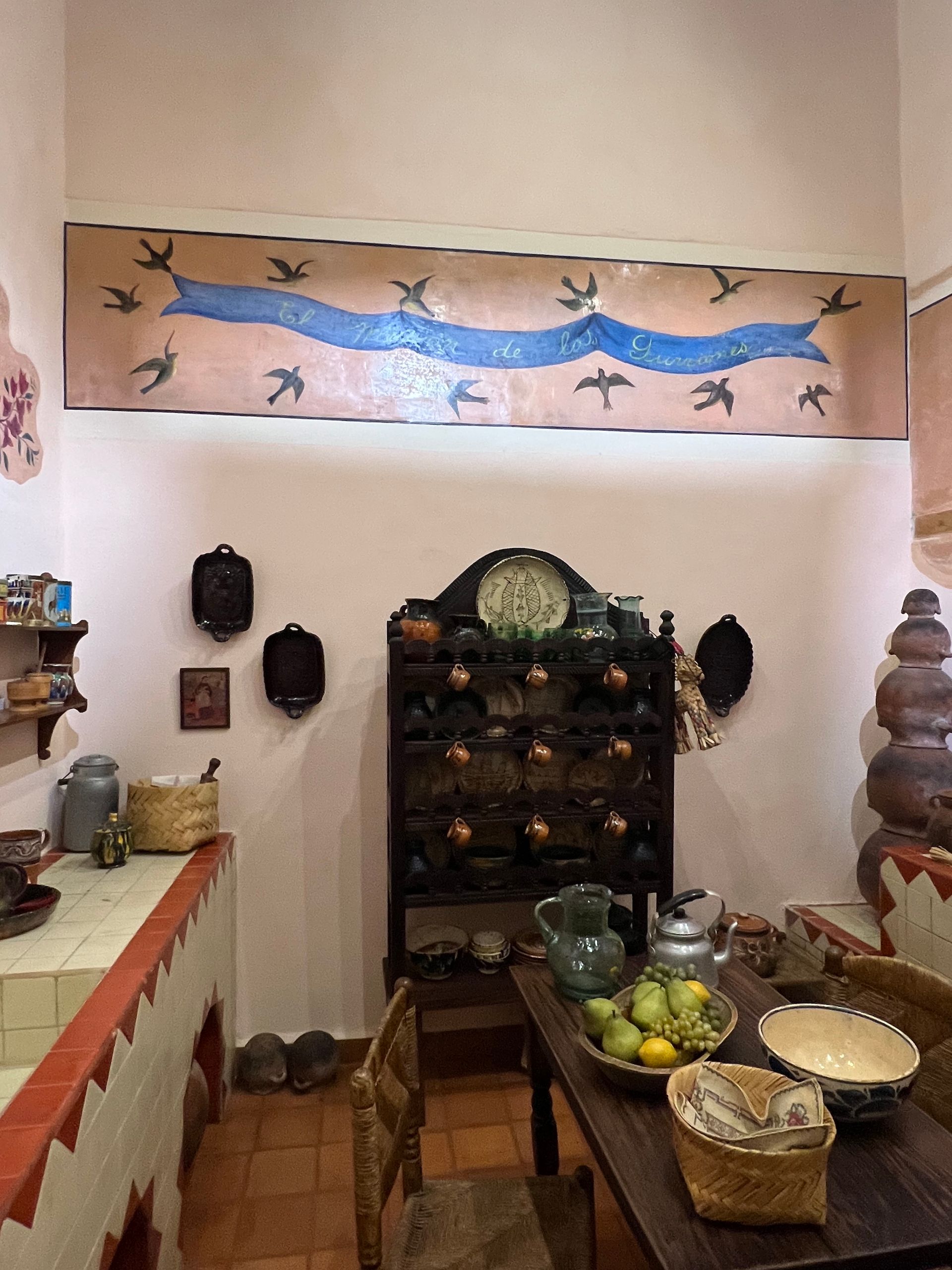 Still, shared motifs emerge between the two houses—as in the case of their kitchens. Like at Casa Roja, Casa Azul features bird-themed wall decorations. Here, clay-outlined doves hold a ribbon, a motif repeated in furniture pieces and pottery dishes. This is no surprise: Frida loved birds, a motif often seen in her art.