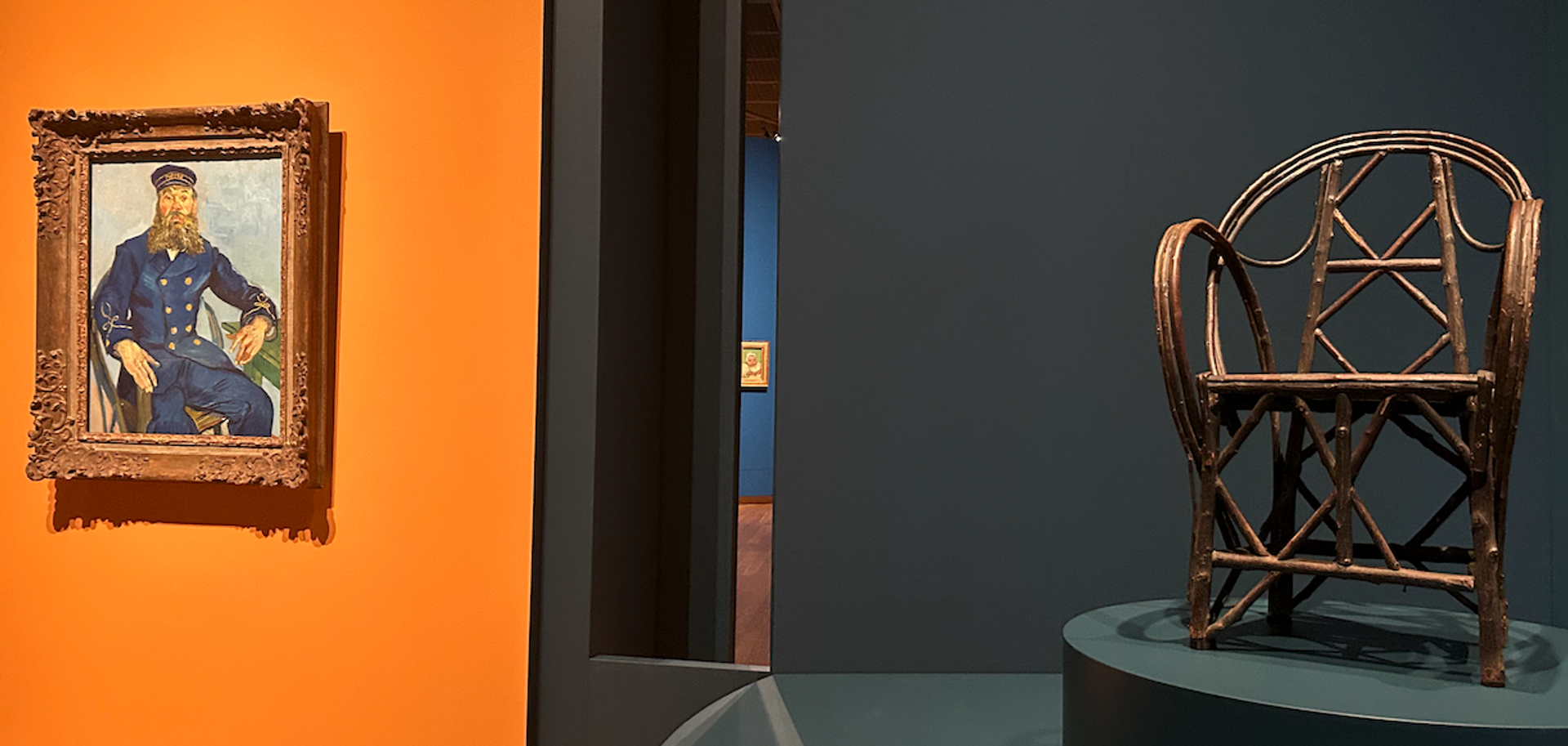 Van Gogh’s Postman Joseph Roulin and the actual chair, presented in the exhibition Van Gogh and the Roulins: Together Again at Last (until 11 January 2026)