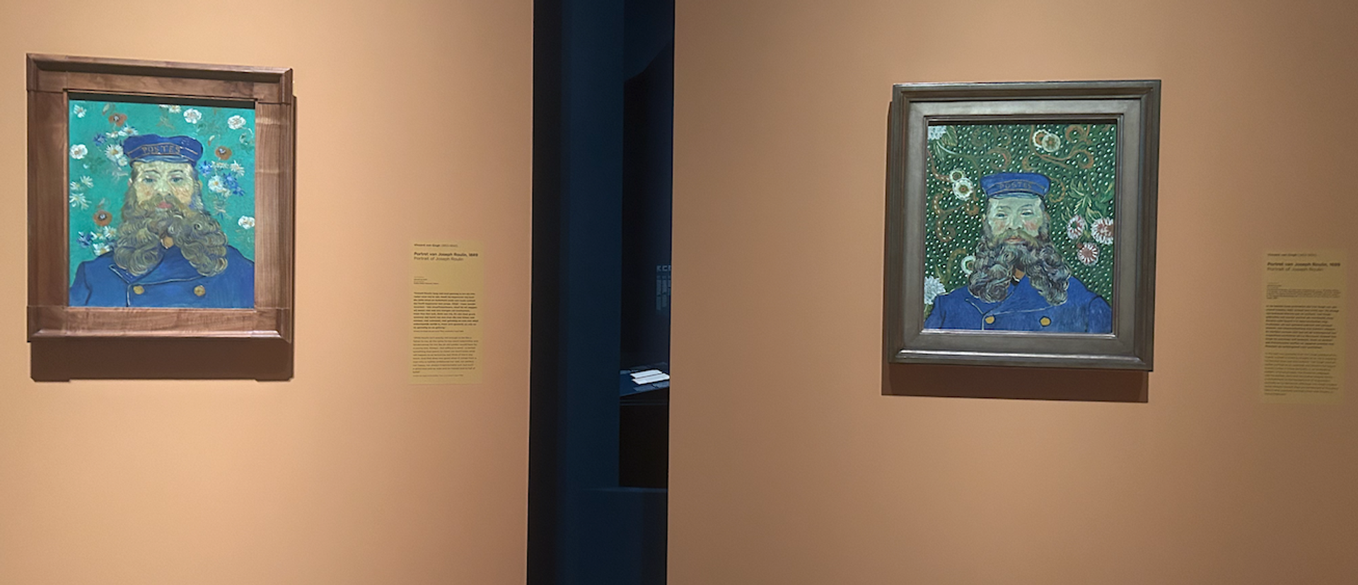 At Amsterdam’s Van Gogh Museum the Boston painting is accompanied by the original chair on which Roulin posed on 31 July 1888. The chair had been bought by Van Gogh for the Yellow House, where he lived in Arles.