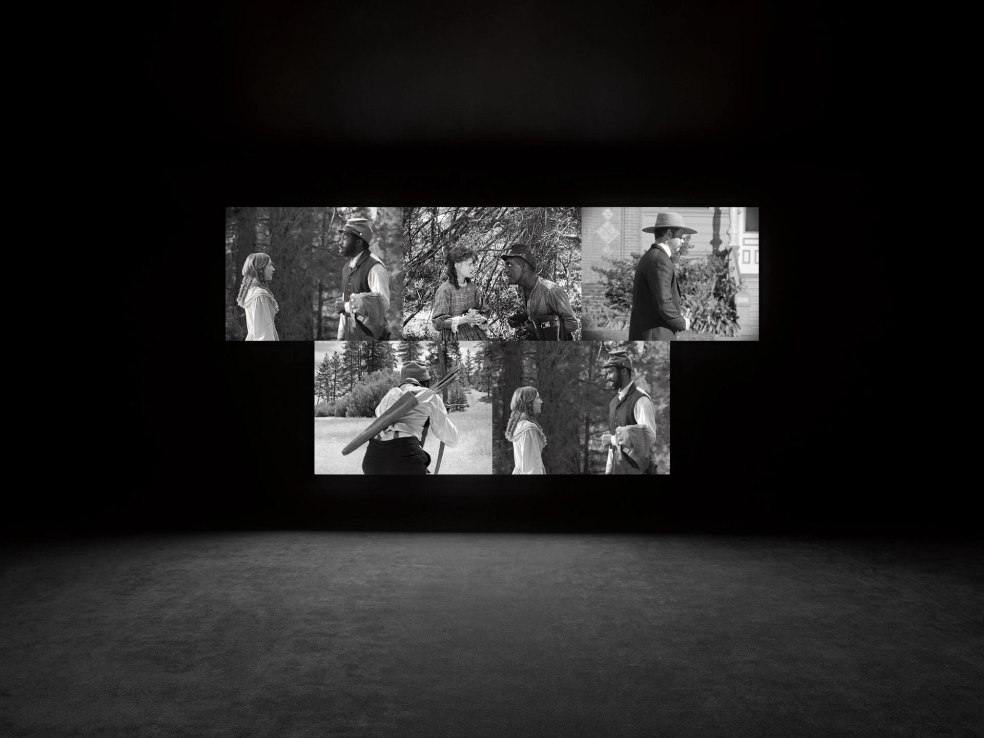 With a title evoking D.W. Griffith’s controversial 1915 film The Birth of a Nation—regarded as one of Hollywood’s most infamous films—Stan Douglas presents his new 13-minute video across five screens. Known for remixing and blending fact with fiction, the multi-channel video installation centres on a violent moment from Griffith’s film involving Gus, a white actor in blackface, Flora, a young white woman, and the KKK. On one screen, Douglas shows the original scene, while the other four feature remakes including two new Black characters, Tom and Sam. Like Gus they are Confederate captains, though their identities are blurred. Through this, Douglas explores themes of misidentification and racial perception.