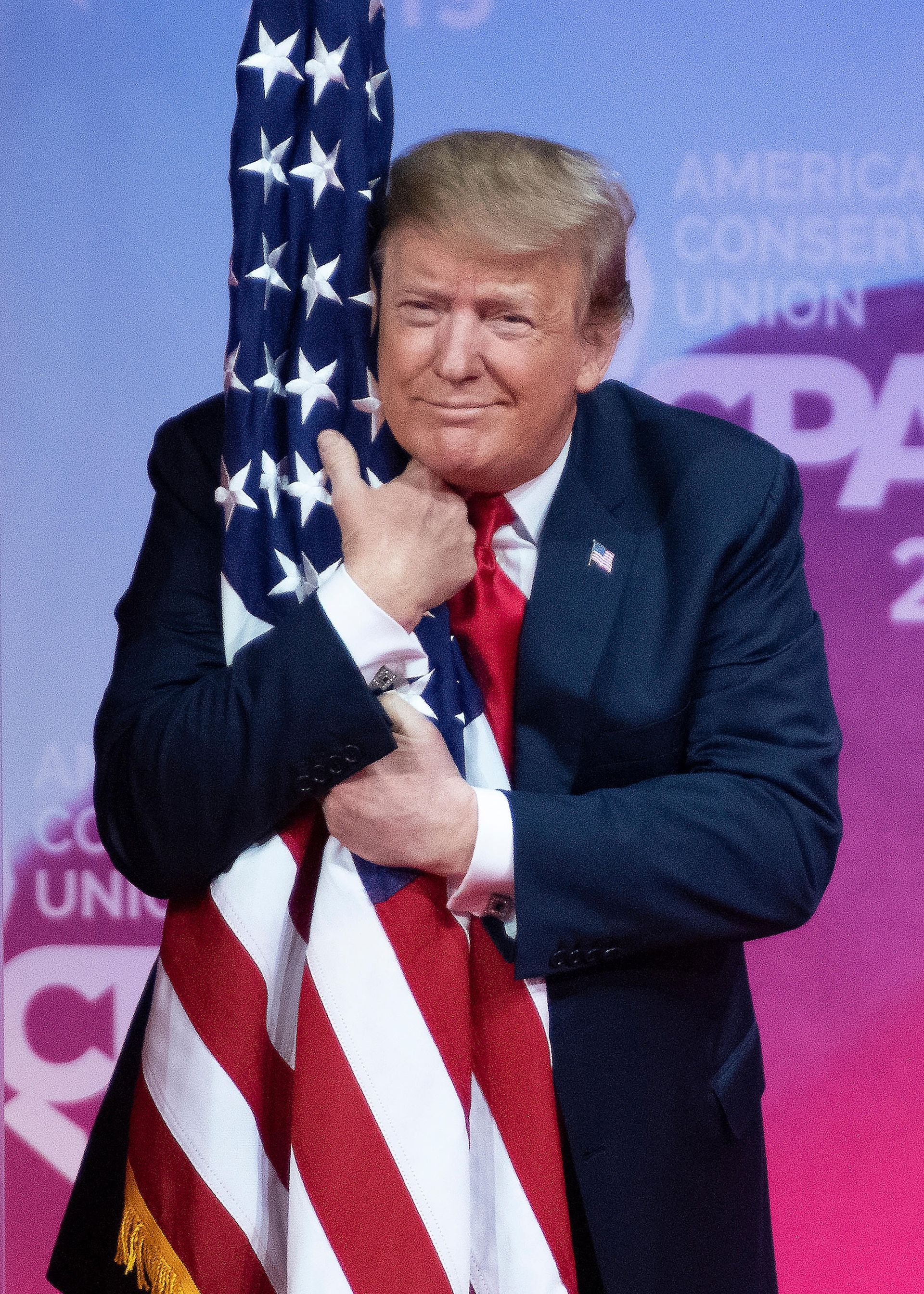 US president Donald J. Trump hugs the American flag as he arrives to speak at the Conservative Political Action Conference in March 2019 Credit: Ron Sachs/CNP/AdMedia Photo via/Newscom/Alamy Live News