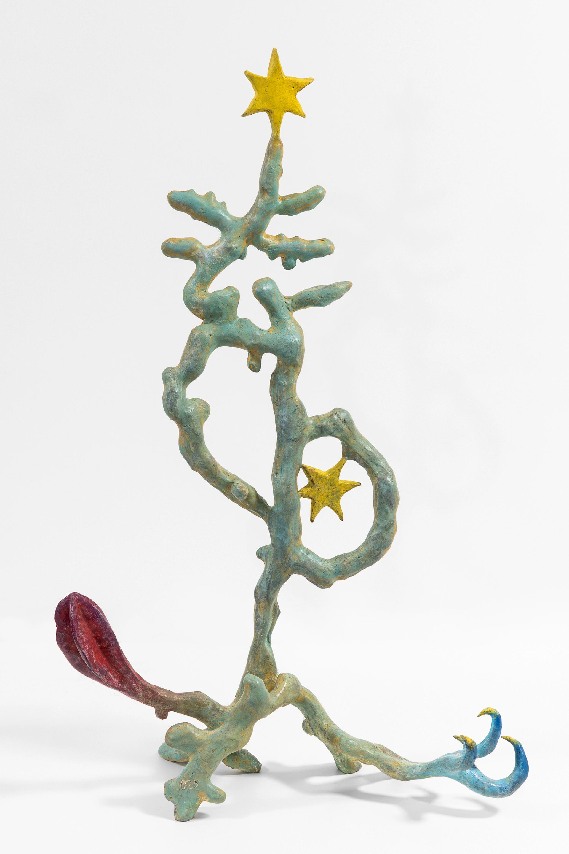Material serves as an important part of Diambe’s practice. Their painting Infinito Inquieto Imortal (2025), made using egg tempera, offers a natural landscape in pinks, purples, yellows and blues. “My generation of Afro-Brazilian artists are interested in reformulating traditions; for me, it’s using techniques that are related to [past] traditions,” they say, pointing out that egg tempera came to the country from Egypt. Diambe’s sculpture Mañana estaré lejos (2025) presents an abstract, green tree-like structure with two distinct yellow stars. “I was thinking a lot about stars when I made this set of works and how they guide movements through land,” they explain. But, most importantly, the piece is made out of bronze. Despite being denied a visa to Nigeria, they say they “had the opportunity to visit West Africa, the Republic of Benin, looking at how bronze sculptures were made” in the Benin Kingdom, now known as Benin City in Edo State, Nigeria. During this trip, they learned about the “very complex history” around the Benin Bronzes.