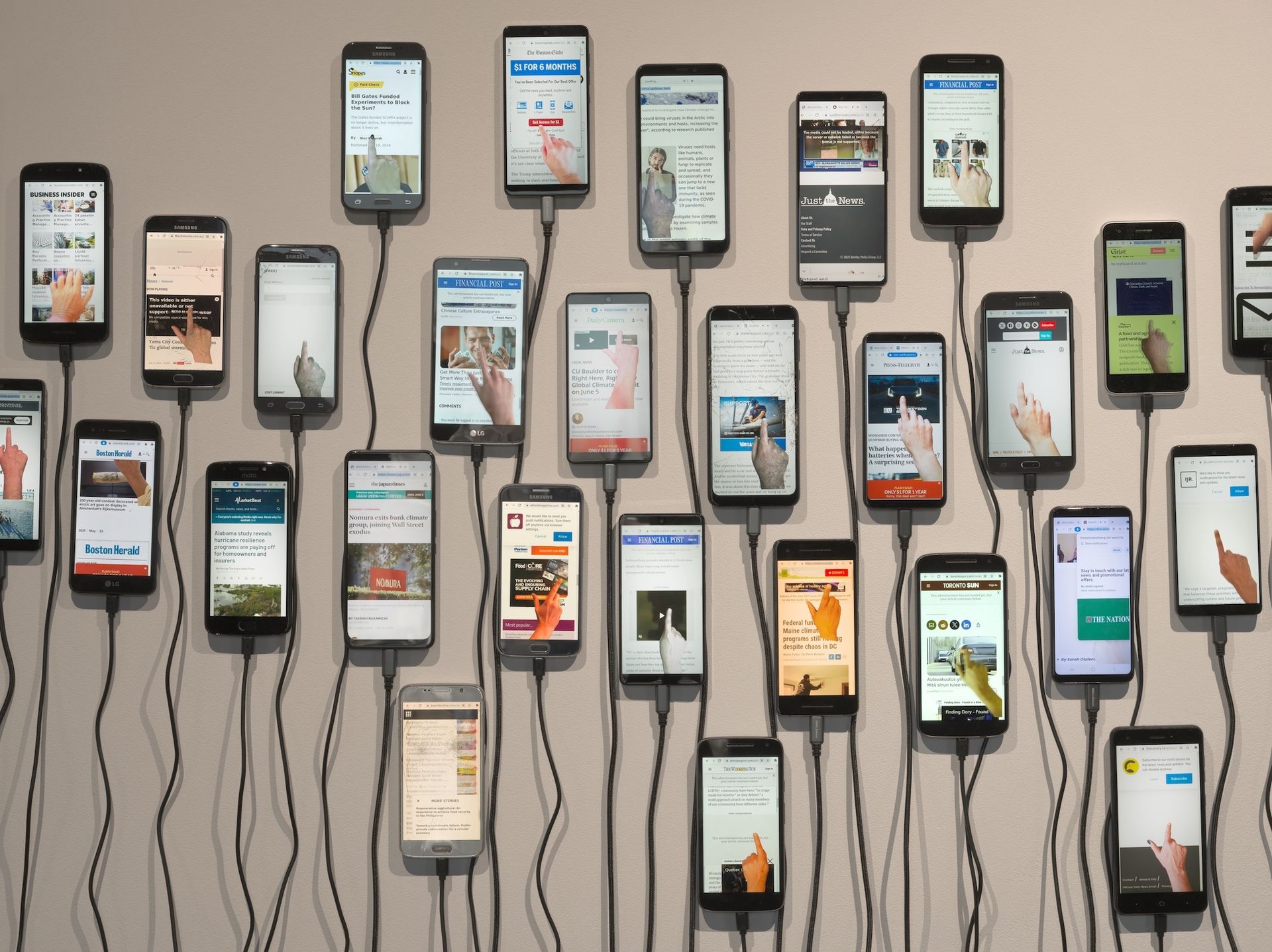 Yet How to Get to Zero tempers its moral gravity with aesthetic levity, in a way that recalls the 1990s culture jamming stunts of The Yes Men. Perfect Sleep (2021), for example, consists of a recliner, an audio meditation and an anti-productivity phone app that mock-seriously guides users to decrease their carbon footprint by increasing the proportion of their days spent at rest, until they eventually reach a state of “total sleep”. An absurdist glee also animates Synthetic Messenger (2021), which features a cacophonous gaggle of wall-hanging cell phones, each programmed to search for climate change news articles and click on their accompanying ads in order to boost the articles’ engagement statistics and thereby support such journalism.