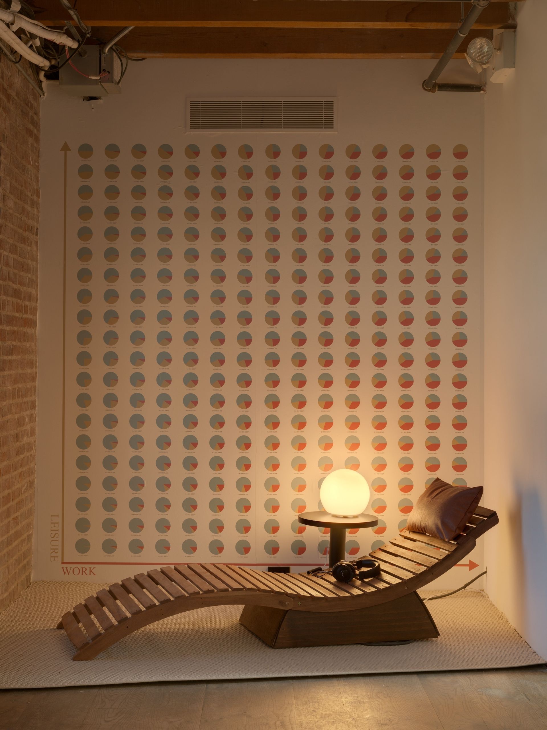 Installation view of Tega Brain and Sam Lavigne: How To Get To Zero at Pioneer Works featuring Tega Brain and Sam Lavigne, Perfect Sleep, 2021 Courtesy of the artists and Pioneer Works. Photo by Dan Bradica Studio.