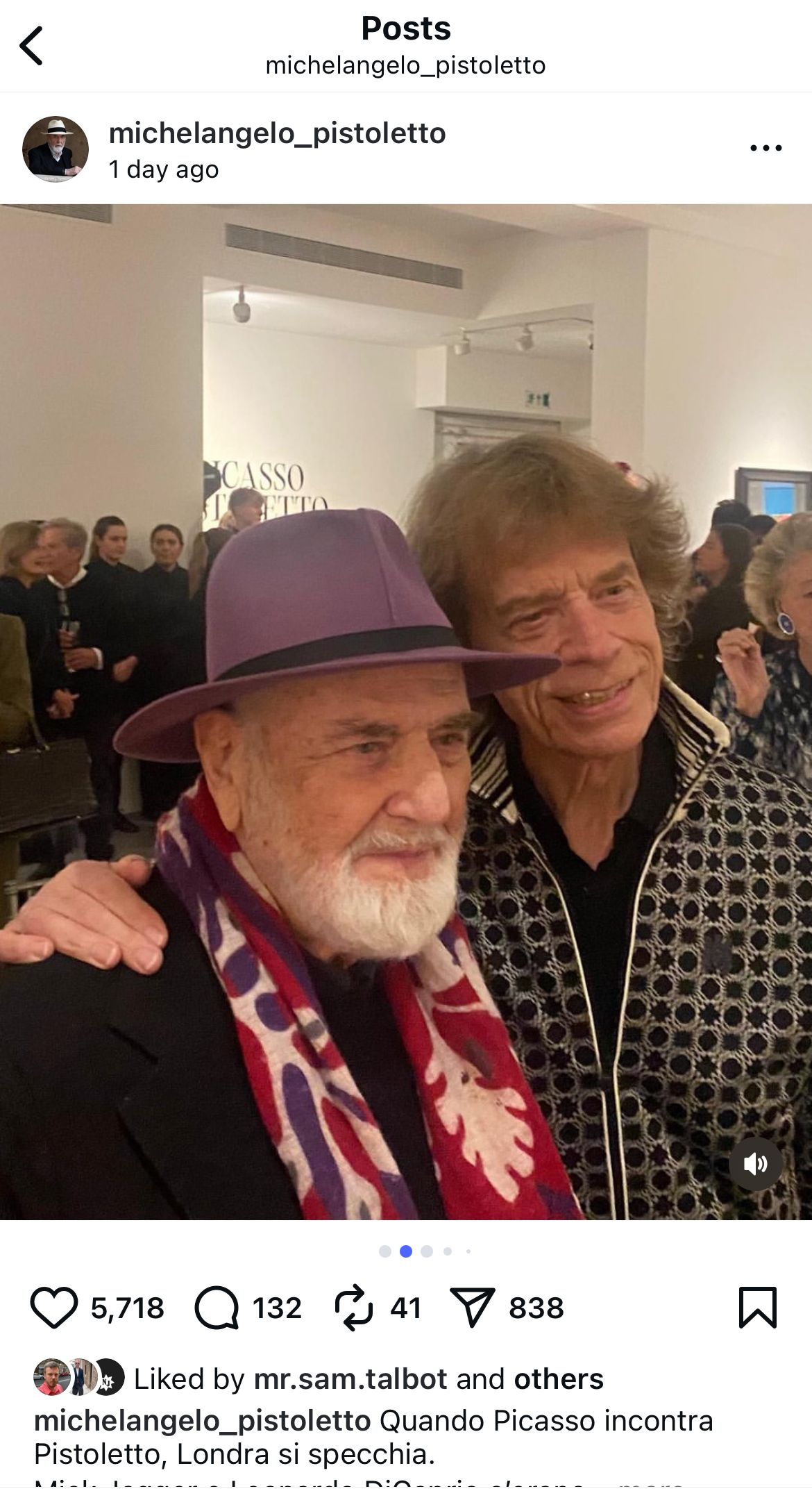 They nearly share a name and they both have iconic status. They are also both extremely sprightly considering their greatly advanced years. It was hard to tell who was the more excited when Mick (Jagger) met Michelangelo (Pistoletto) for the first time at the opening of Nahmad Projects’s exhibition, which intersperses 15 of Pistoletto’s new Mirror Paintings with classic Cubist paintings by Pablo Picasso. The duo went on to bond further at a dinner held in the gallery with the dapper king of Arte Povera also conducting an animated conversation with the famously art loving Leonardo DiCaprio. It was the conceptual artist, rather than the actor or the rock star, who chose to post the encounter on his Instagram.