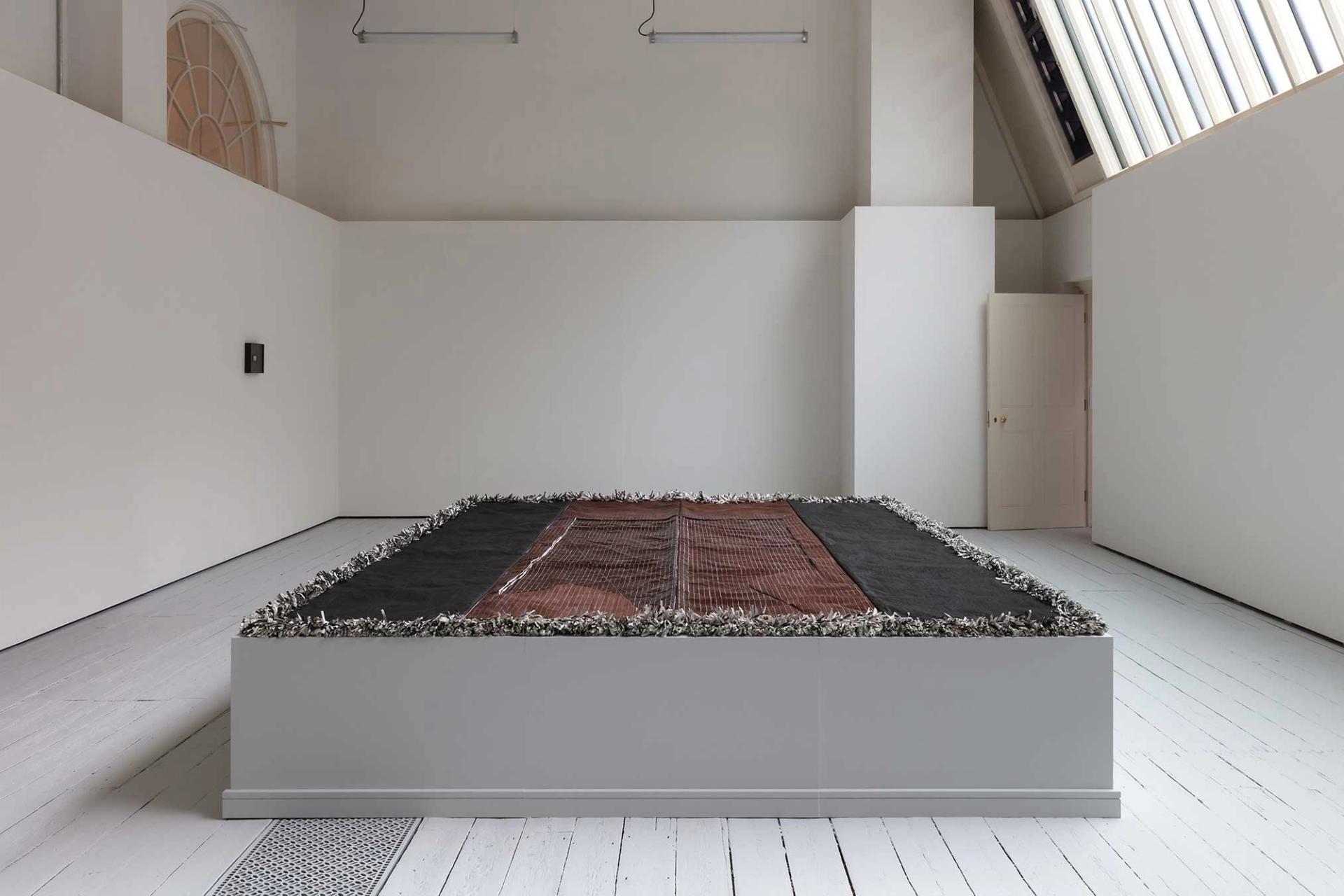 A thread that connects Sasraku’s work is an interest in raw materials; specifically, how they connect with landscapes and how they operate within works of art. In the past she has used ancient pigments foraged from different corners of the British Isles. For the work seen here, Sasraku’s starting point is another primordial substance: crude oil, which becomes a vehicle to explore themes of national identity and conflict.