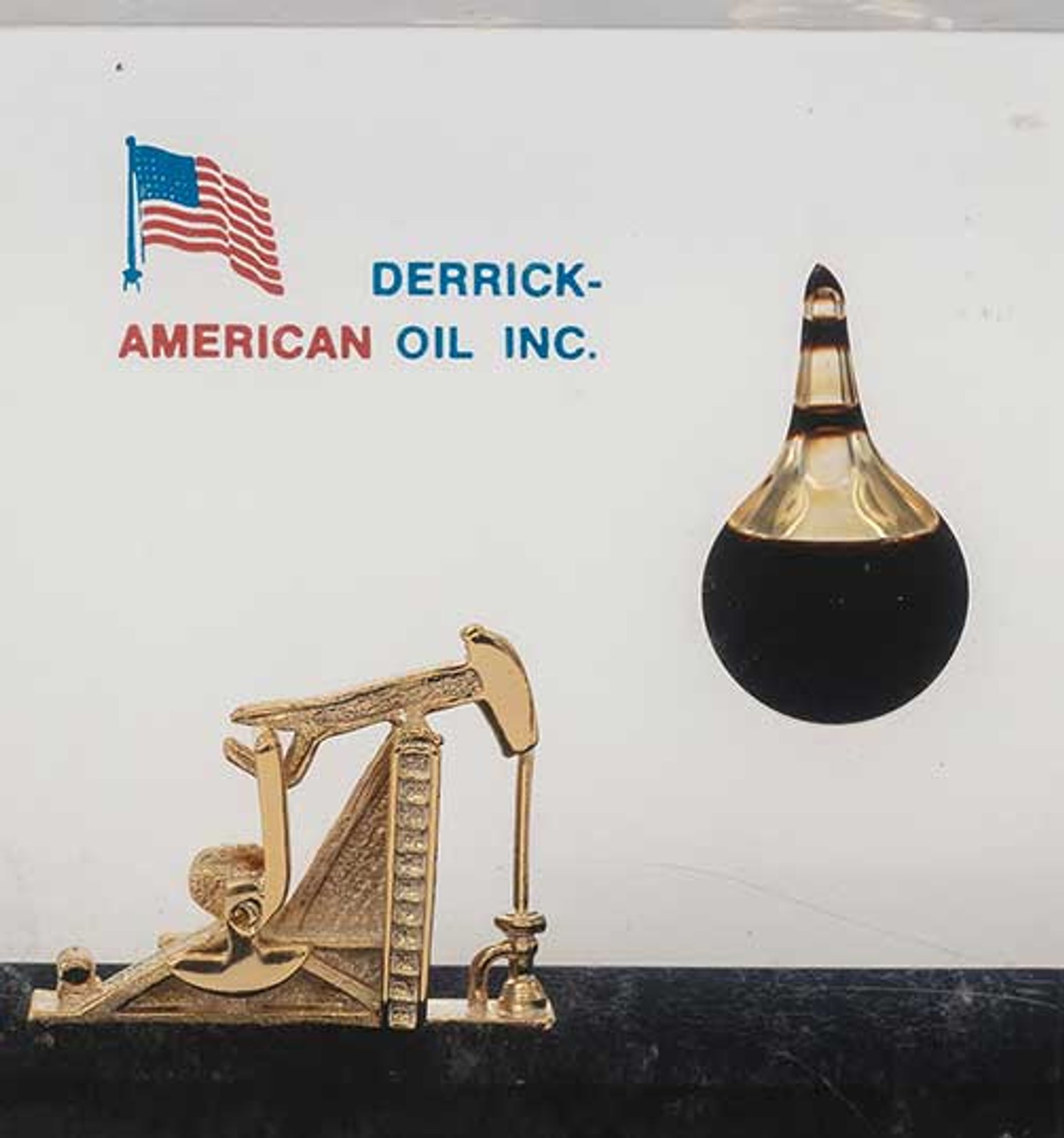 Tanoa Sasraku: Over the past two years I’ve been collecting both personalised military ephemera—morale patches, medal ribbon bars, hand-painted armour, scrapbooks—and corporate mementos and trinkets from the oil industry, specifically these crude-oil filled paperweights. The phrase “morale patch” felt like a term that united the functions of the paperweights and, particularly, the ribbon bars. Both are distributed to veterans of those industries to try and attach meaning and order to working lives which are defined by the chaotic whims of politicians and bureaucrats.