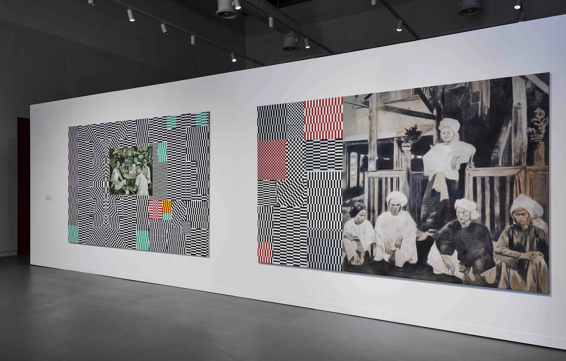 Born into Burma’s royal family but exiled since childhood, to Yawnghwe his recreations of family photographs, in oil paintings embedded within fields of abstract geometric patterns, represent a forever unknowable aspect of himself. “[The works] represent the impossibility of reconciliation of my family history,” he explains.
