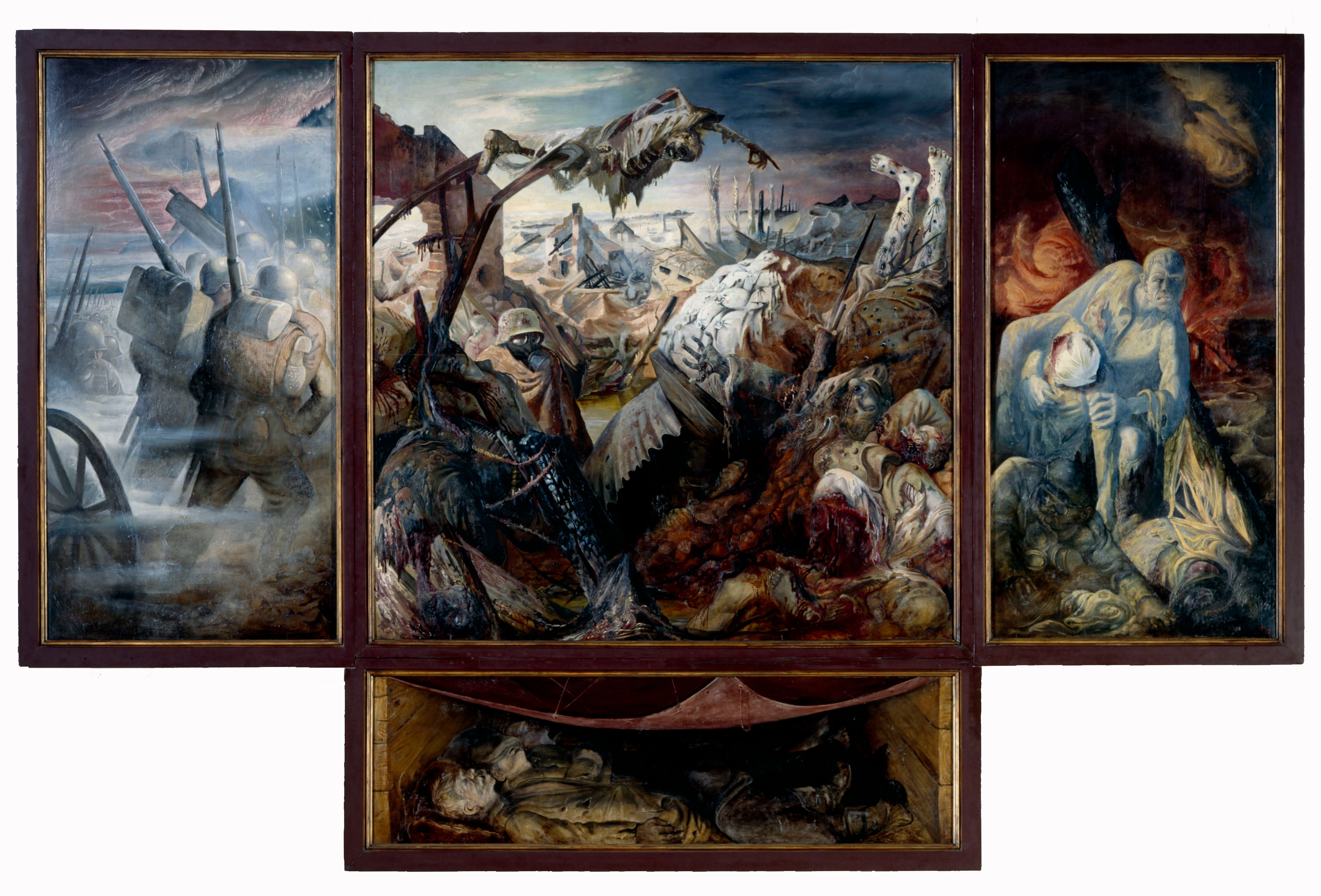 Dix, an army veteran, created a number of anti-war works, but The War, a triptych with a predella, may be his most powerful. It is inspired by Germany’s Old Masters, notably Matthias Grünewald, and blends shocking hyperrealism with nightmarish fantasy.